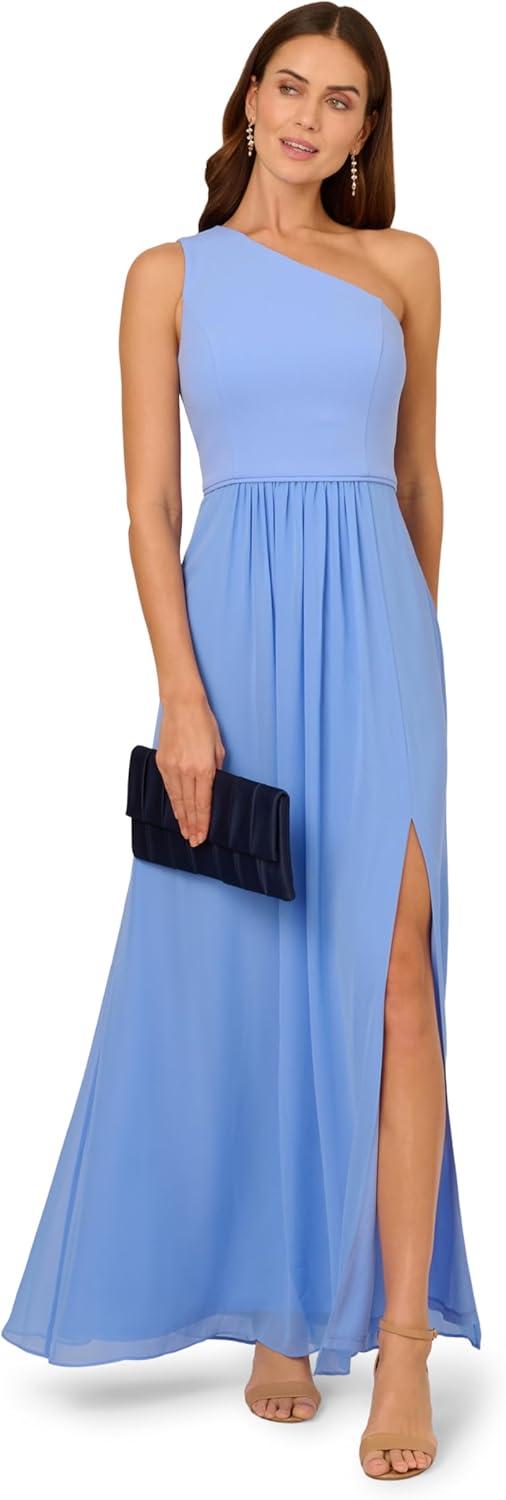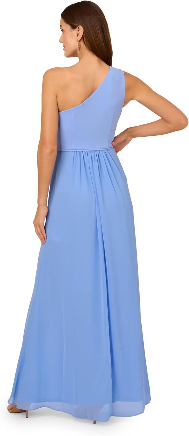 Adrianna Papell Floral Print Chiffon Gown with One Shoulder Neckline(Electric Ice)