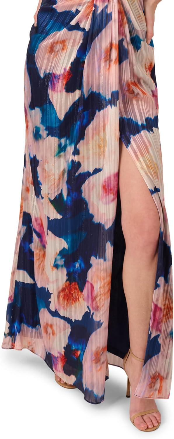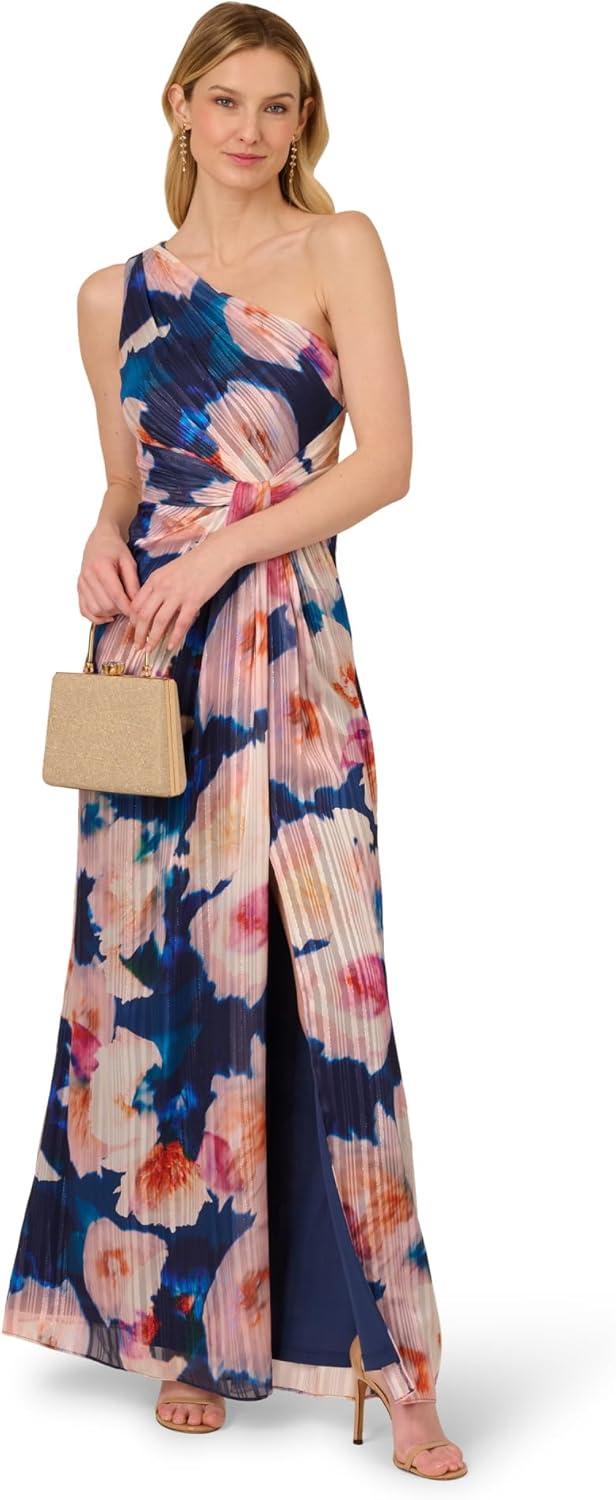 Adrianna Papell Floral Print Chiffon Gown with One Shoulder Neckline(Navy/Blush)