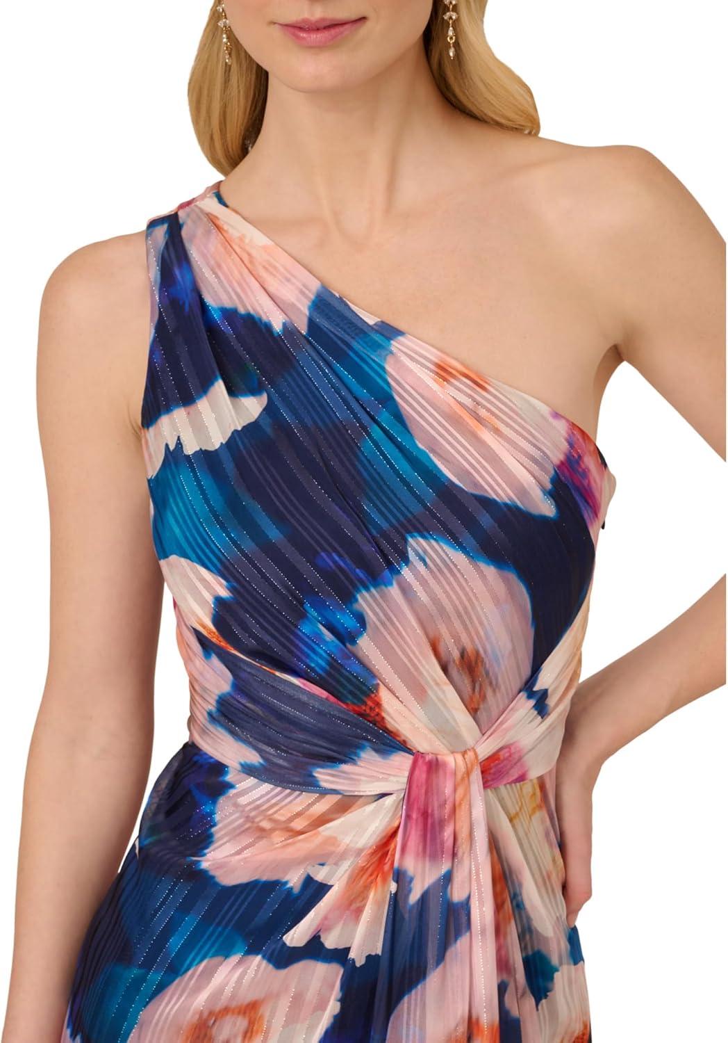 Adrianna Papell Floral Print Chiffon Gown with One Shoulder Neckline(Electric Ice)