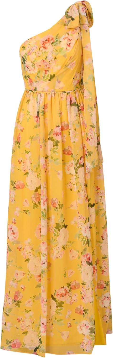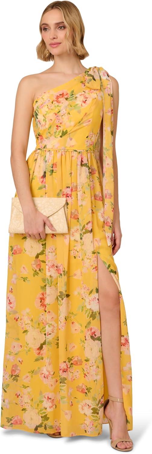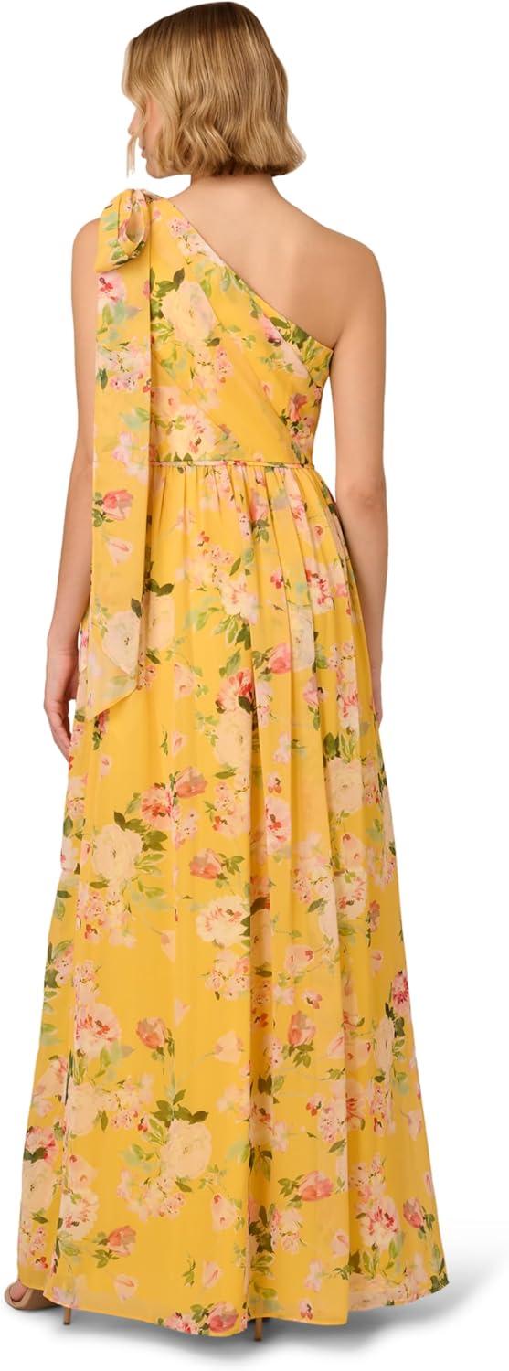 Adrianna Papell Floral Print Chiffon Gown with One Shoulder Neckline(Yellow Multi)