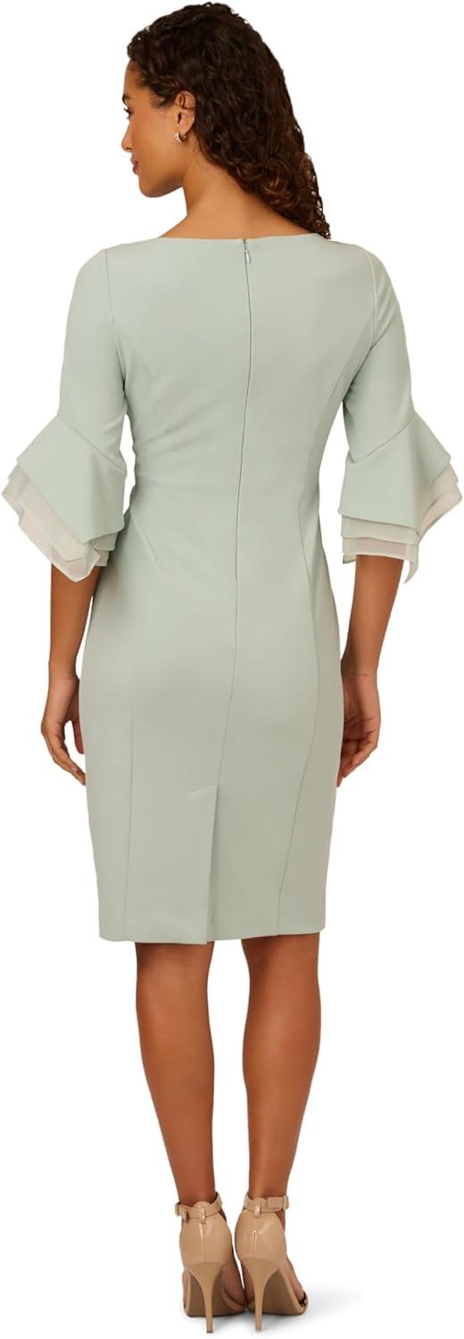 Dressed up meets versatile in this timeless sheath dress. This midi dress features a boat neckline, fitted silhouette through the body, and tiered three-quarter bell sleeves with organza accents. Crafted using knit crepe, this day dress has some stretch and no waist seam for a comfortable fit. A zipper back closure and a single pleat at the center back of the skirt hem completes the design.