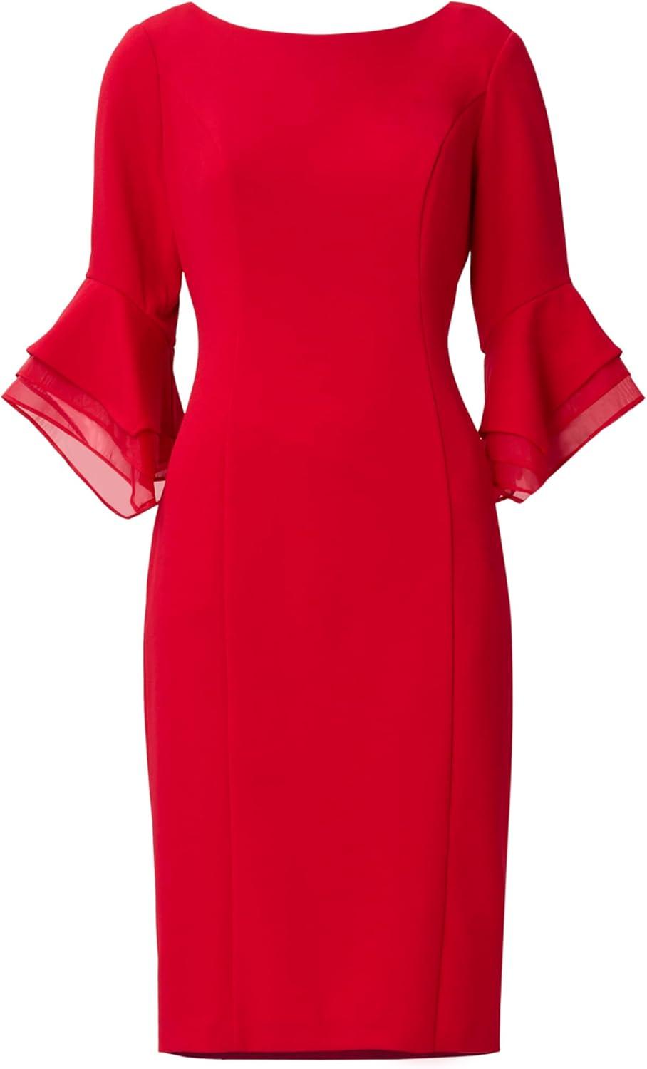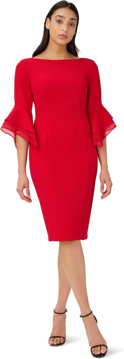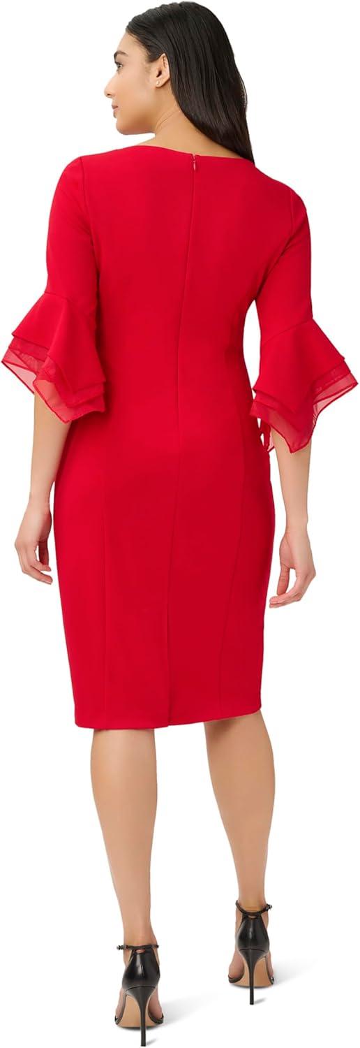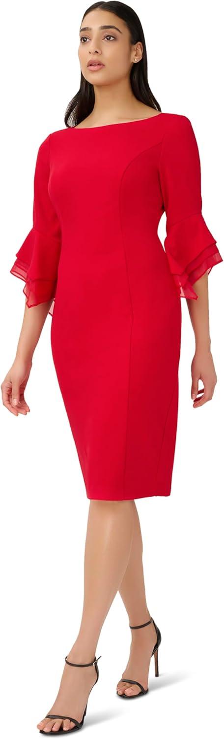 Dressed up meets versatile in this timeless sheath dress. This midi dress features a boat neckline, fitted silhouette through the body, and tiered three-quarter bell sleeves with organza accents. Crafted using knit crepe, this day dress has some stretch and no waist seam for a comfortable fit. A zipper back closure and a single pleat at the center back of the skirt hem completes the design.