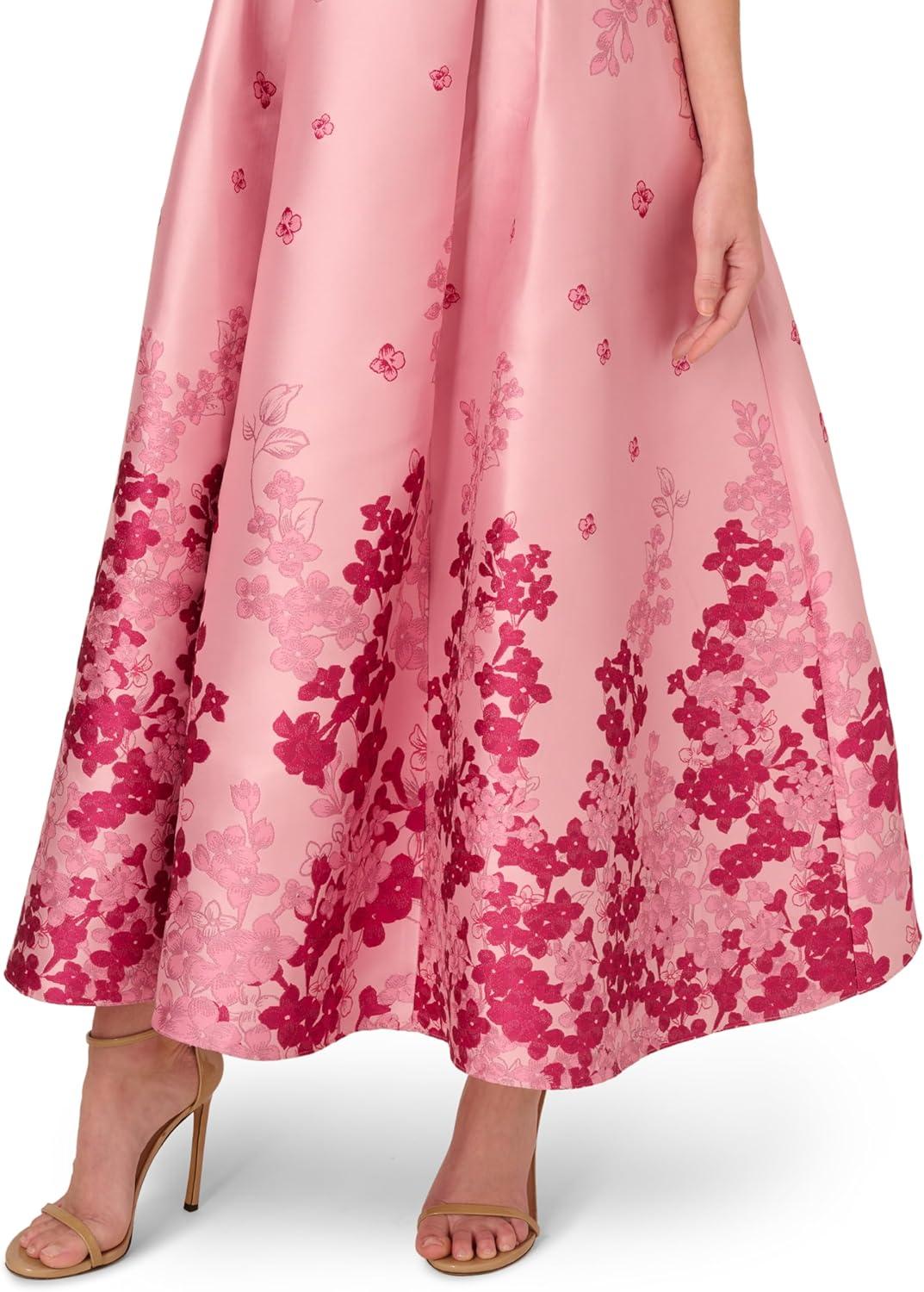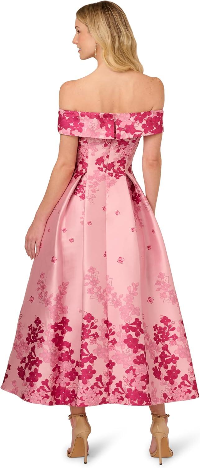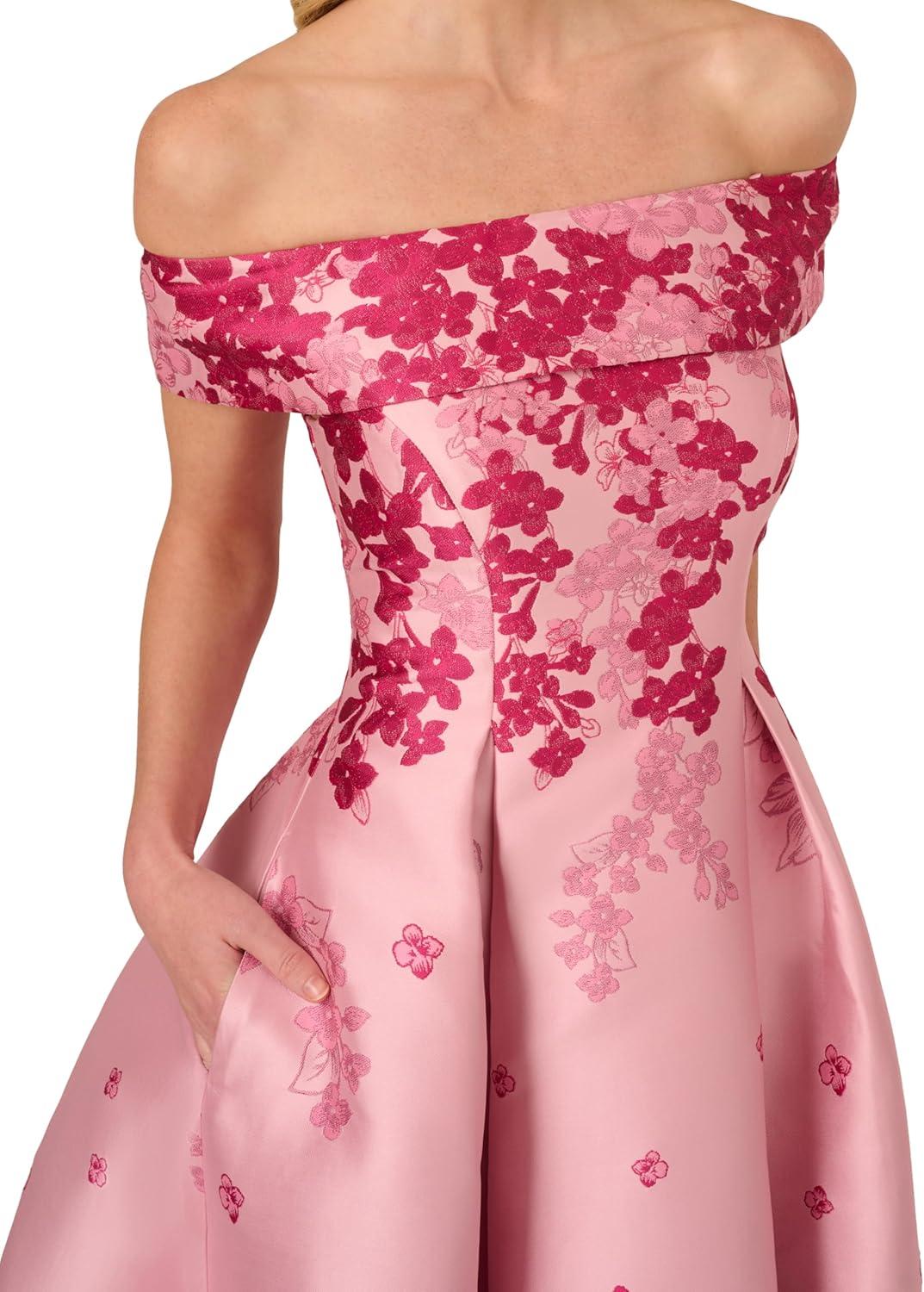 Structured and timelessly beautiful, this floral dress is the missing piece for your next evening out. This fit and flare dress features an off the shoulder neckline with foldover accent, ankle-length skirt, and pockets. Crafted from jacquard fabric boasting a contrasting metallicfloral print, this dress has no waist seam for a comfortable fit for all body types. This off the shoulder dress has minimal stretch. Styled with nude heels and your favorite clutch, this ankle-length dress scales from cocktail attire to black-tie.