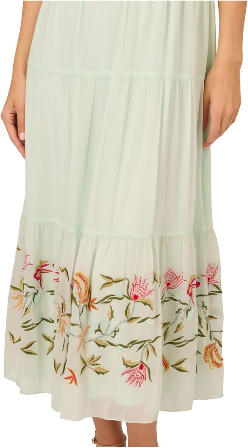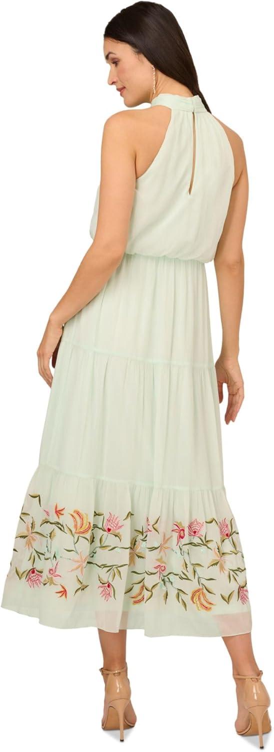 Designed for the evening but equally pretty for a daytime event, this chiffon dress is an effortless look. This midi dress features a halter bodice with mock neckline, a blouson waist, and a tiered skirt with floral embroidery that has subtle beaded accents. Crafted from crinkled chiffon fabric,this pull-on dress is easy to wear and stylish no matter the occasion. From day occasions to evenings out, this sleeveless dress pairs well with nude heels or sandals.