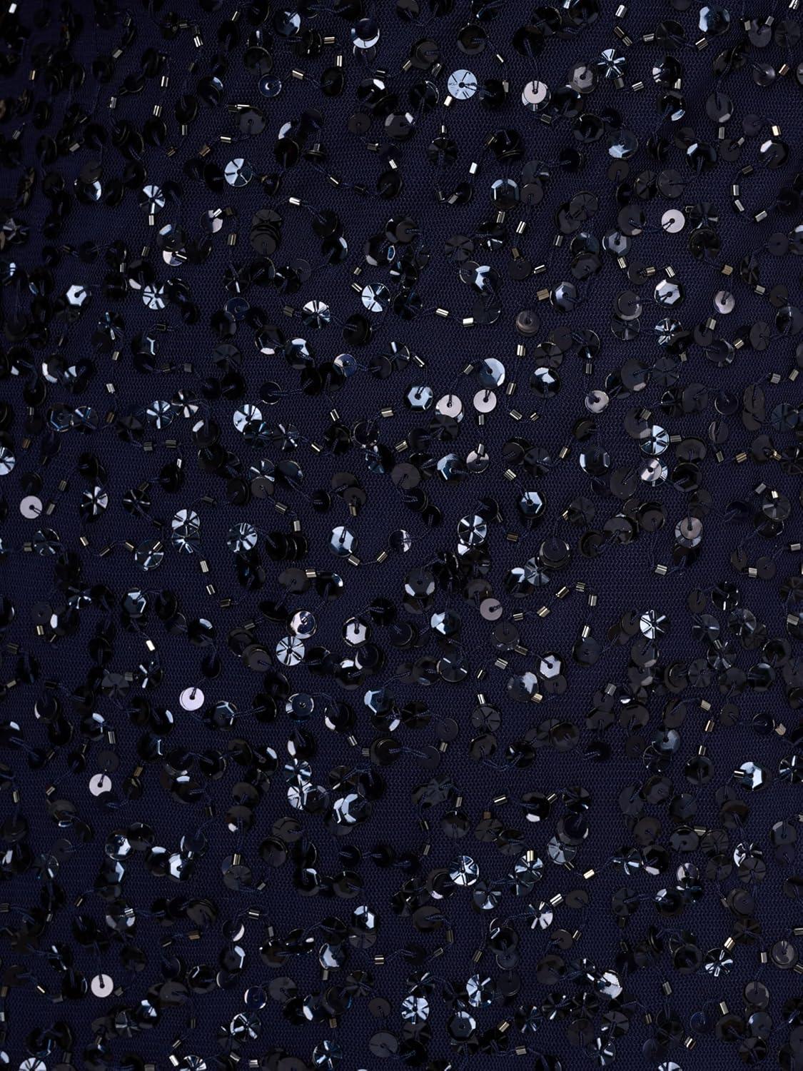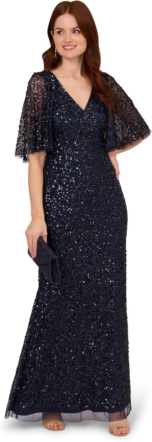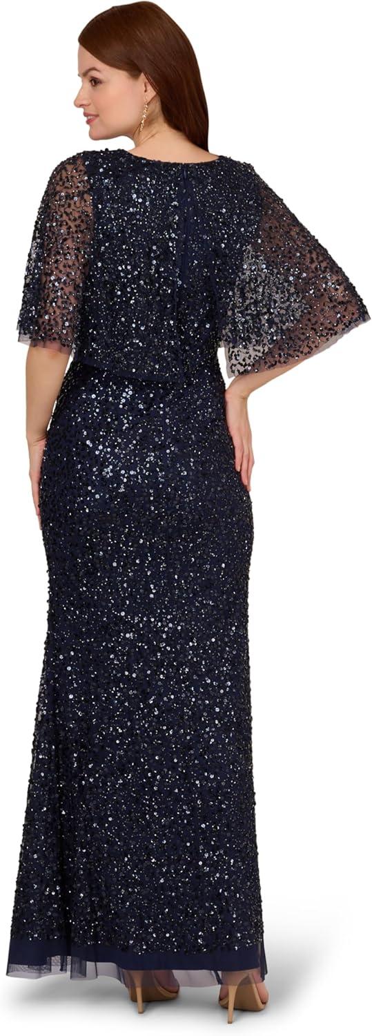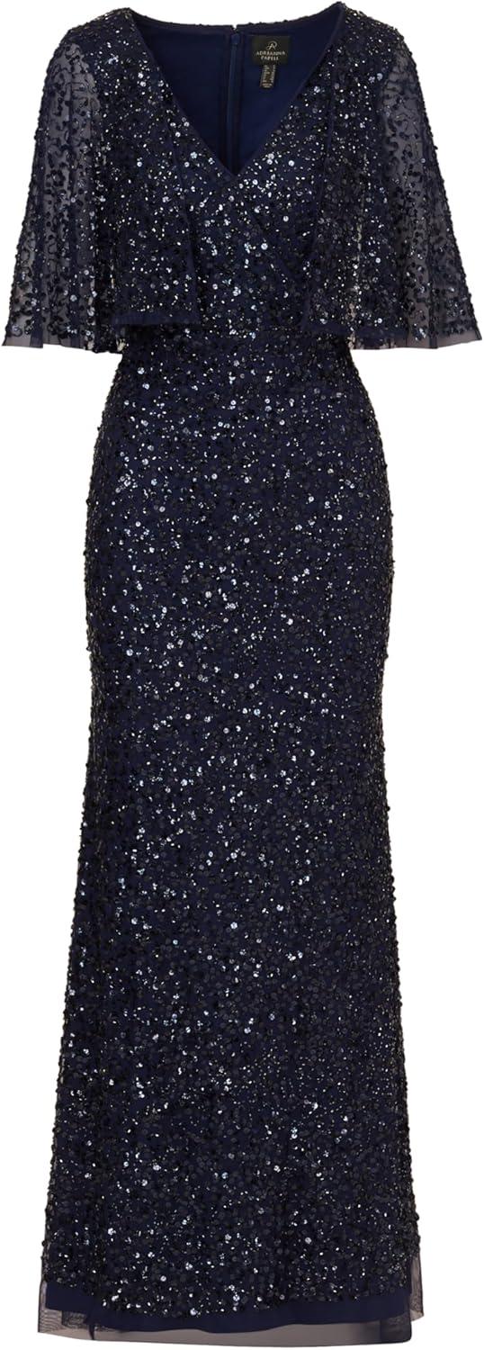 Dramatic details abound in this beaded cape dress. This formal dress features a deep v-neckline, sheer cape sleeves, and a mermaid skirt. Crafted from mesh fabric and fully lined through the body, this mermaid gown is covered in swirls of matching sequins and beading. Ahidden zipper closure at the center back completes this black-tie dress. Style this evening gown with metallic heels and a satin clutch for a complete look at your next wedding or gala.