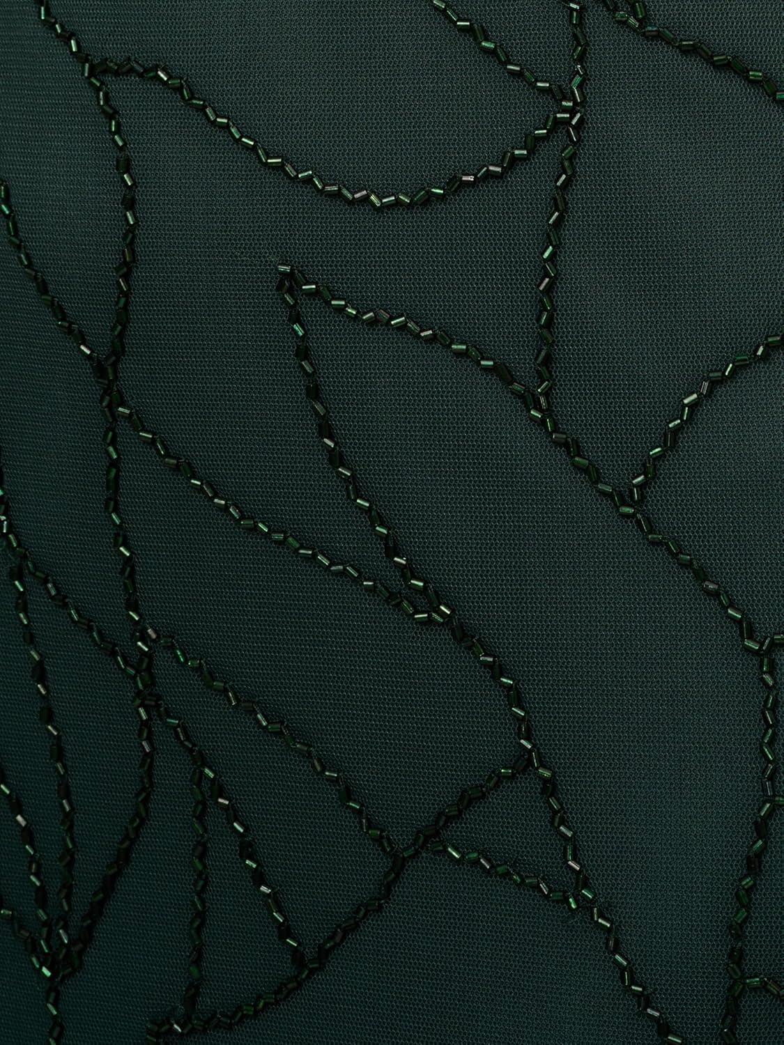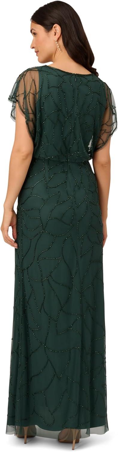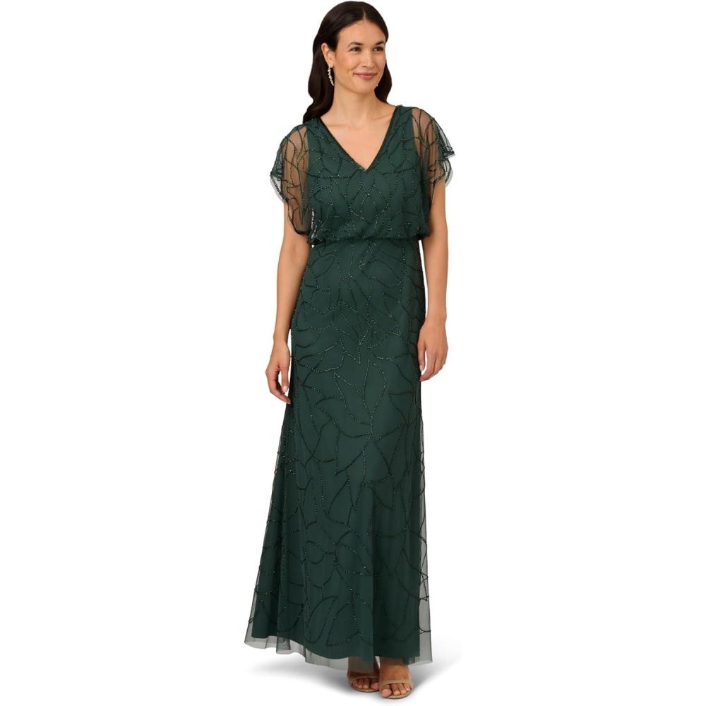 An unforgettable night out starts with this short sleeve beaded gown. This formal dress features a blouson bodice with v-neckline, sheer dolman sleeves, and a soft mermaid skirt. Lined through the body and overlaid with sheer mesh covered in lines of sparkling beads, this evening gown is a timeless style. A zipper closure at the back completes the short sleeve gown. Perfect for black-tie and formal events, this beaded dress will shine with nude heels and a contrasting clutch.