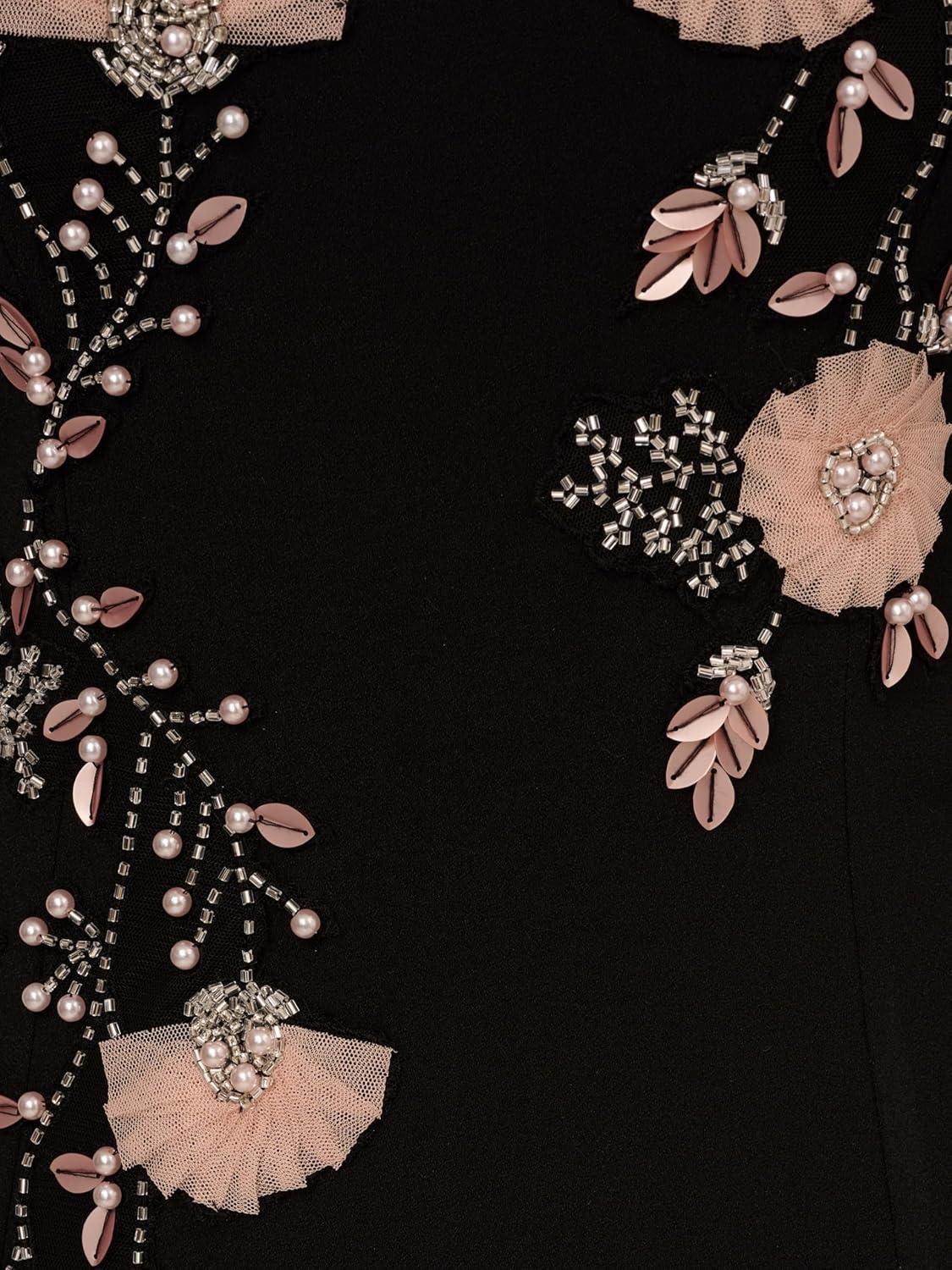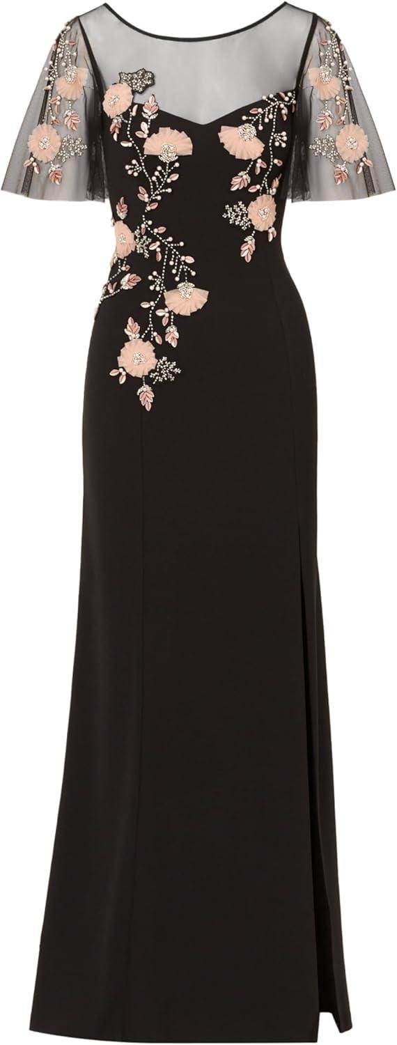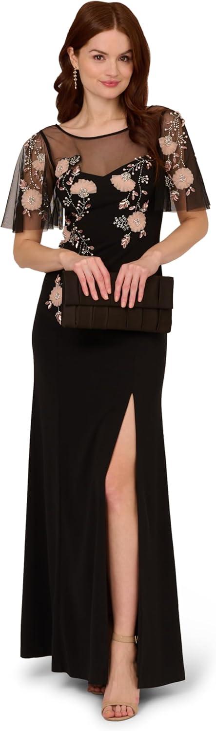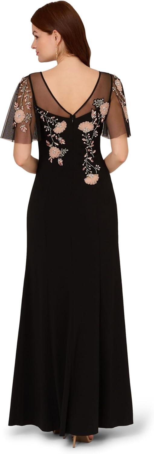Lean into formal season with this sweetly beaded gown. This formal dress features a fitted bodice with boat neckline, a sheer yoke that gives a sweetheart neckline illusion, sheer flutter sleeves and a mermaid skirt with thigh-high slit. Crafted from crepe fabric through the body, thisdress has knit mesh at the bodice and sleeves that is embellished with beautiful sequin beaded florals. A hidden zipper closure at the sheer v-back completes this black-tie dress. Styled with neutral accessories that let the floral beading shine, this flutter short sleeve gown is a romanticlook.