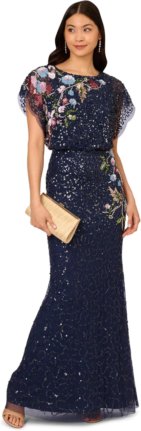 This is a mermaid gown made out of an all over beaded embellished mesh knit fabric with a boat neckline, dolman sleeves, blouson waist, and zipper at the center back.