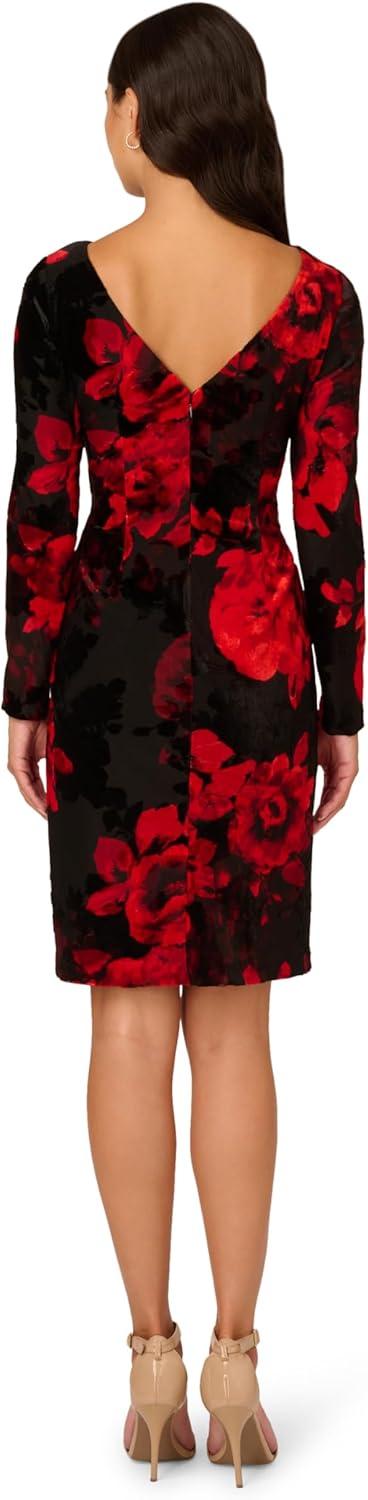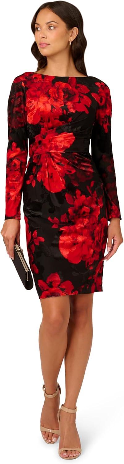 A sleek long sleeve above-the-knee dress, this stretch velvet boat neck style is a timeless wardrobe staple. The soft and lustrous burnout velvet fabric features a classic floral pattern thats easy to dress up or down. Draping at the waist adds texture to the design. Pair the dresswith a jacket and boots for a day out, or dress it up with heels and jewelry for evening looks.