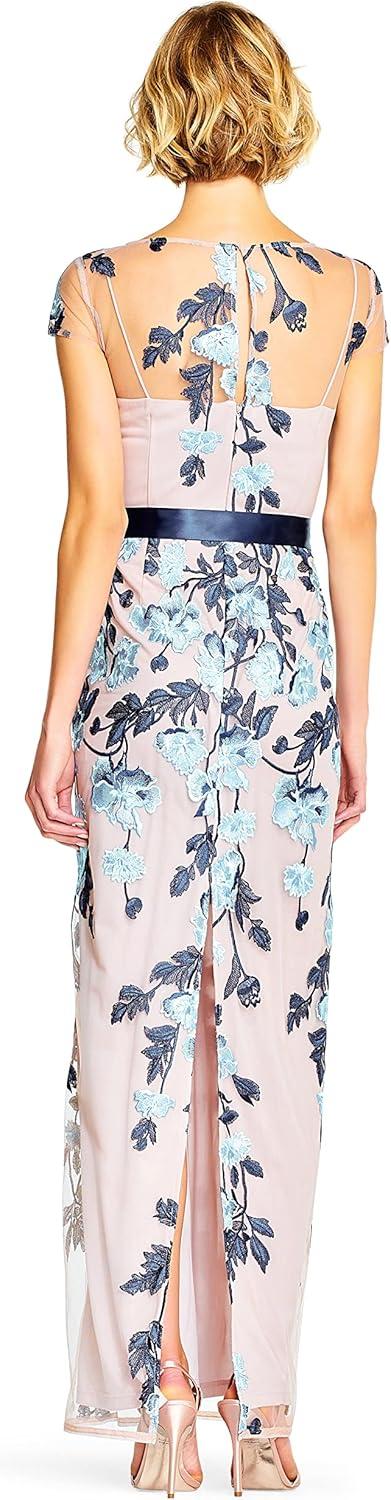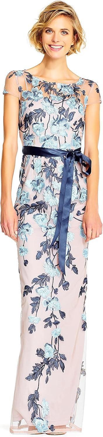 Sophisticated and striking, our long column gown blooms with beautiful floral embroidery over a mesh fabric and is finished with a satin ribbon tie waist that adjusts for a flattering fit. All the details: sheer illusion yoke and short sleeves. Back keyhole and hook-and-eye/zip closure.