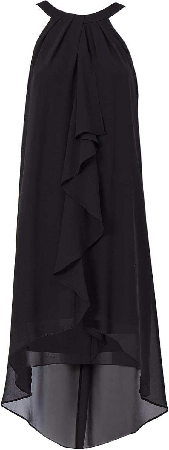 Crafted from a lightweight and airy woven chiffon, this easy-fitting dress is your answers to what to wear to every occasion. Featuring a cutaway halter neckline with pleated details, front keyhole and a dramatic cascading front ruffle accent. Finished with a flirty high/low hemline. Pulls on over head. Stretch knit jersey lining for added comfort. Designed to impress at so many occasions – from brunch to dinner and from baby shower to wedding celebrations.