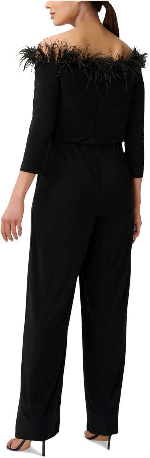 Elegant yet sexy, youll make a fashion statement at your next special event in our off-the-shoulder jumpsuit. Were obsessed with the fluffy feathers that adorn the neckline on this chic one-piece wonder crafted of a luxe stretch jersey fabric. All the details: a flattering blouson silhouette, three-quarter sleeves and wide-leg pants. Back elastic waistband for added comfort and zip closure.