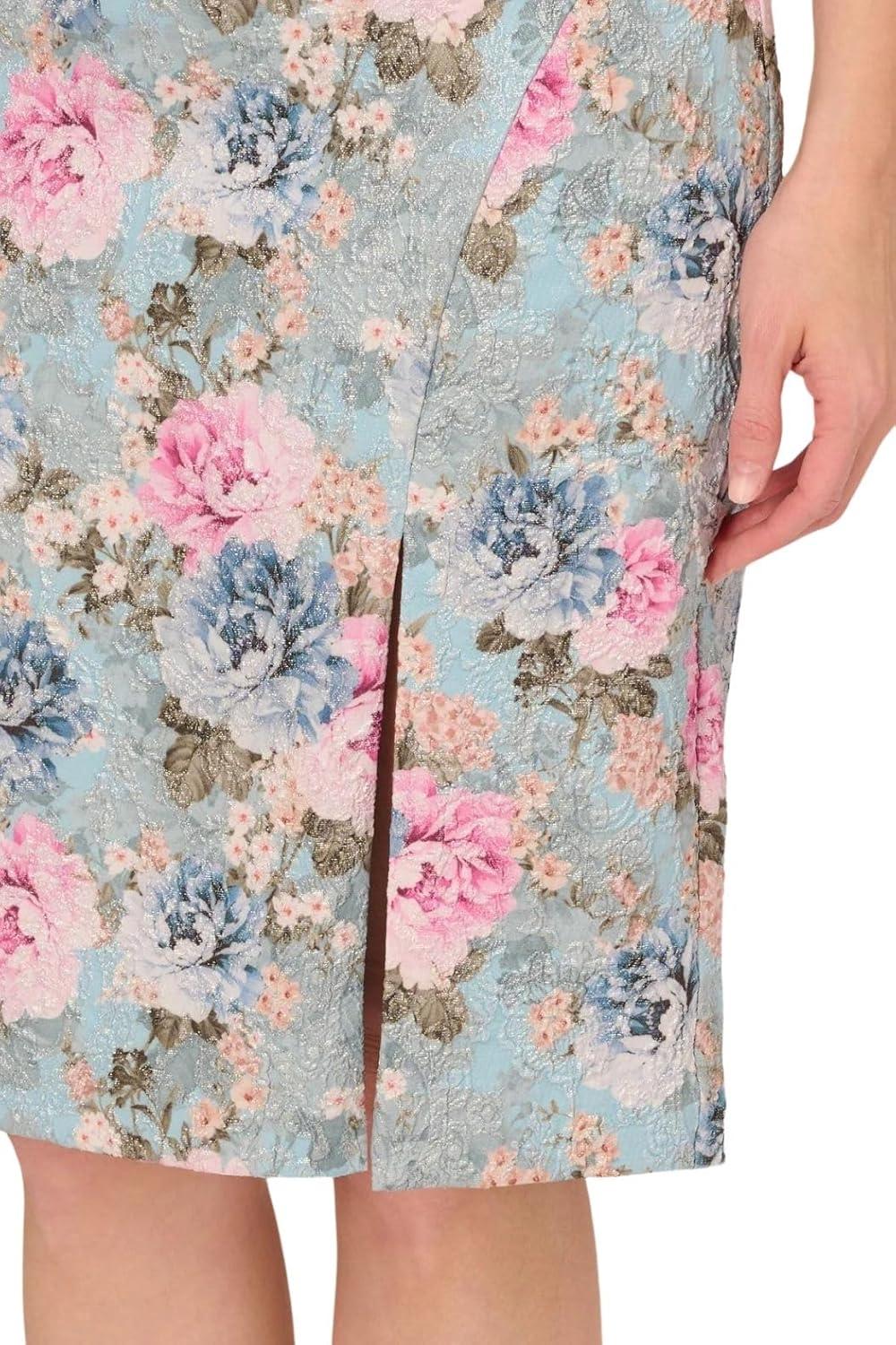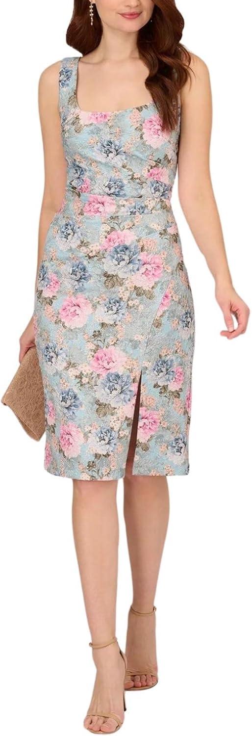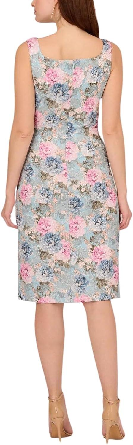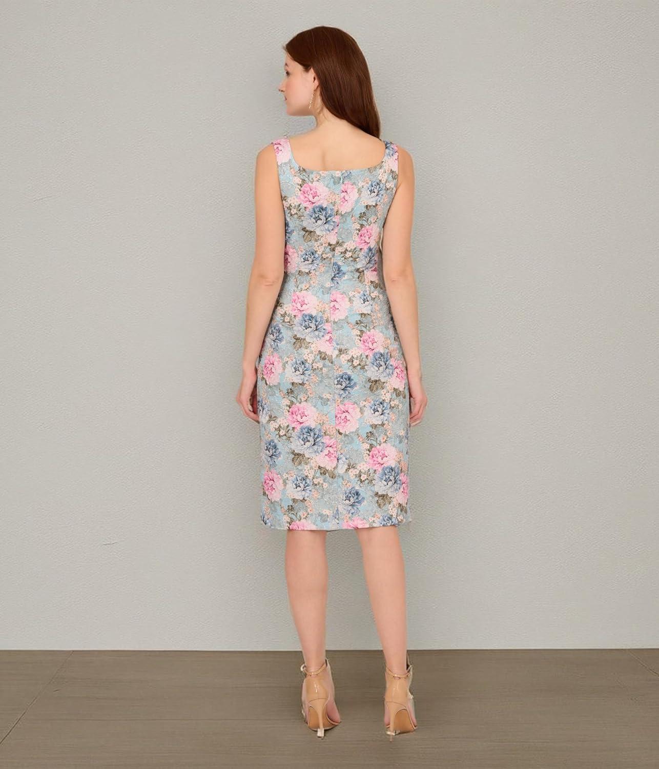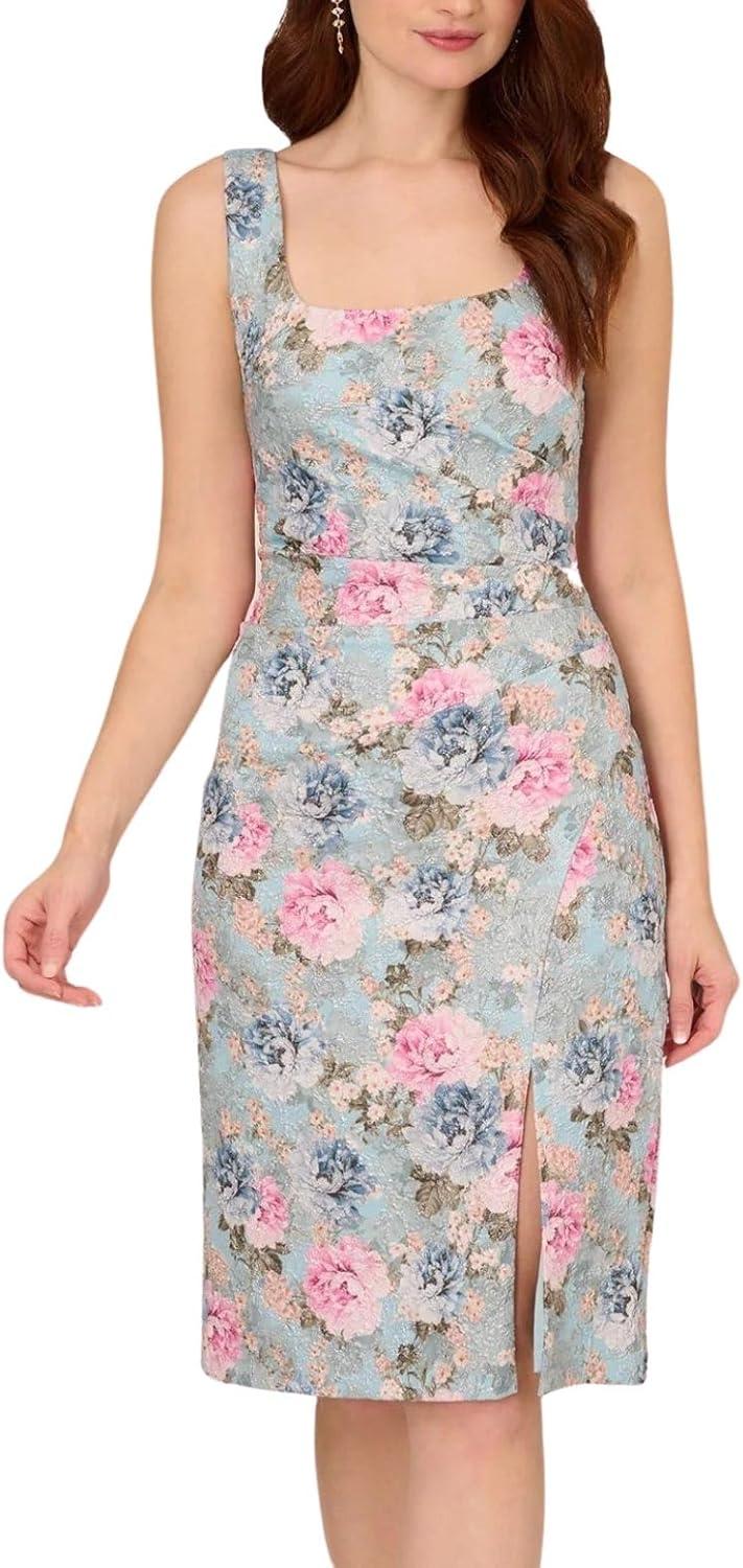 Its easy to impress when you select this sheath dress for your next event. This floral dress features a tank-strap bodice with square neck and back, fitted silhouette, and a slit at the side of the skirt. Crafted from floral matelasse fabric, which shows off subtle shine, this dress is drapedthrough the body for a flattering fit. A zipper closure at the center back completes this sleeveless dress. Styled with nude or metallic heels, this modern yet timeless dress will elevate your plans.