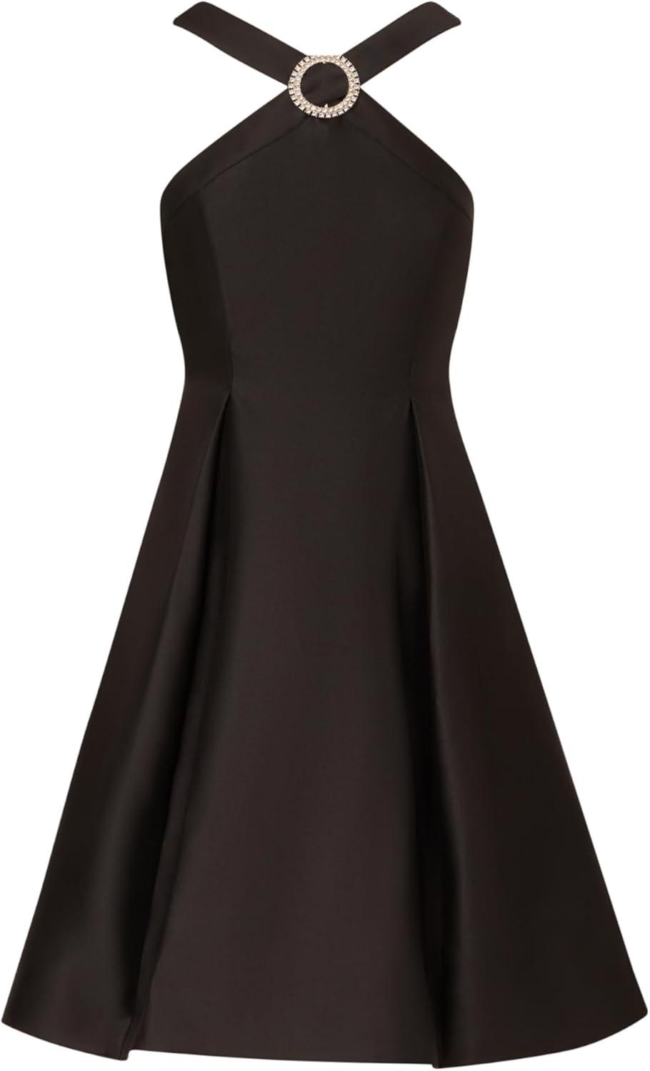 Step into glamour with this exquisite black cocktail dress, crafted from luxurious mikado fabric that radiates sophistication and structure. The halter neckline is adorned with a jeweled ring detail that exudes modern elegance, perfect for cocktail parties and special occasions. Designed without a waist seam for a seamless silhouette and boasting convenient pockets, this sleeveless mini dress offers both function and style. Complete with a zipper closure at the center back for a flawless fit, this black halter dress is a must-have for making a statement.