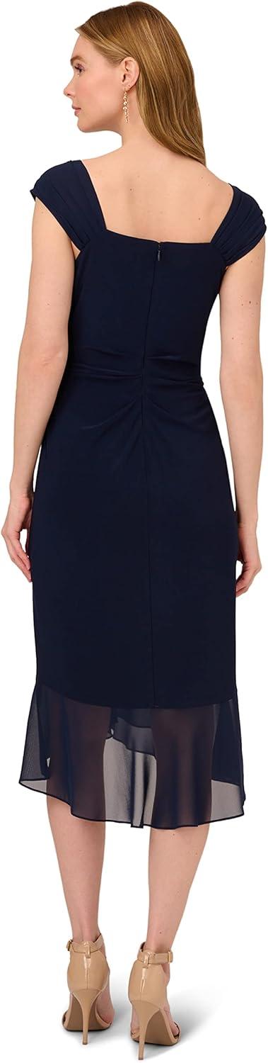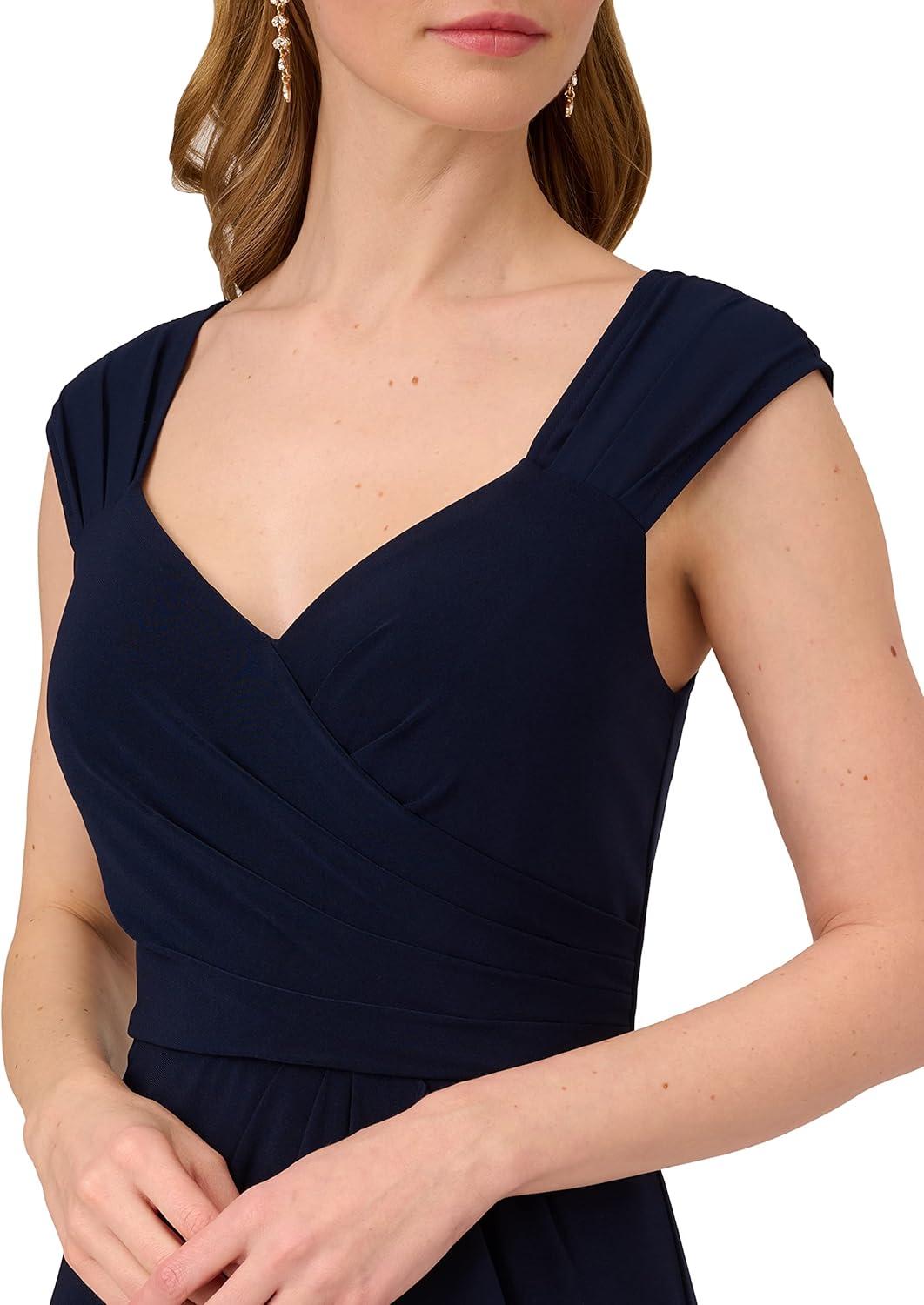 Mixed fabrication elevates this day dress making it undeniably chic. This sheath dress features a sleeveless, surplice bodice with a sweetheart neckline. Crafted from chiffon and jersey fabric, this bra-friendly dress features pleated details at the shoulders and is accented by cascadingdraping that flows into a flounce hem at the skirt. A zipper closer at the back finishes the look of this faux-wrap dress.