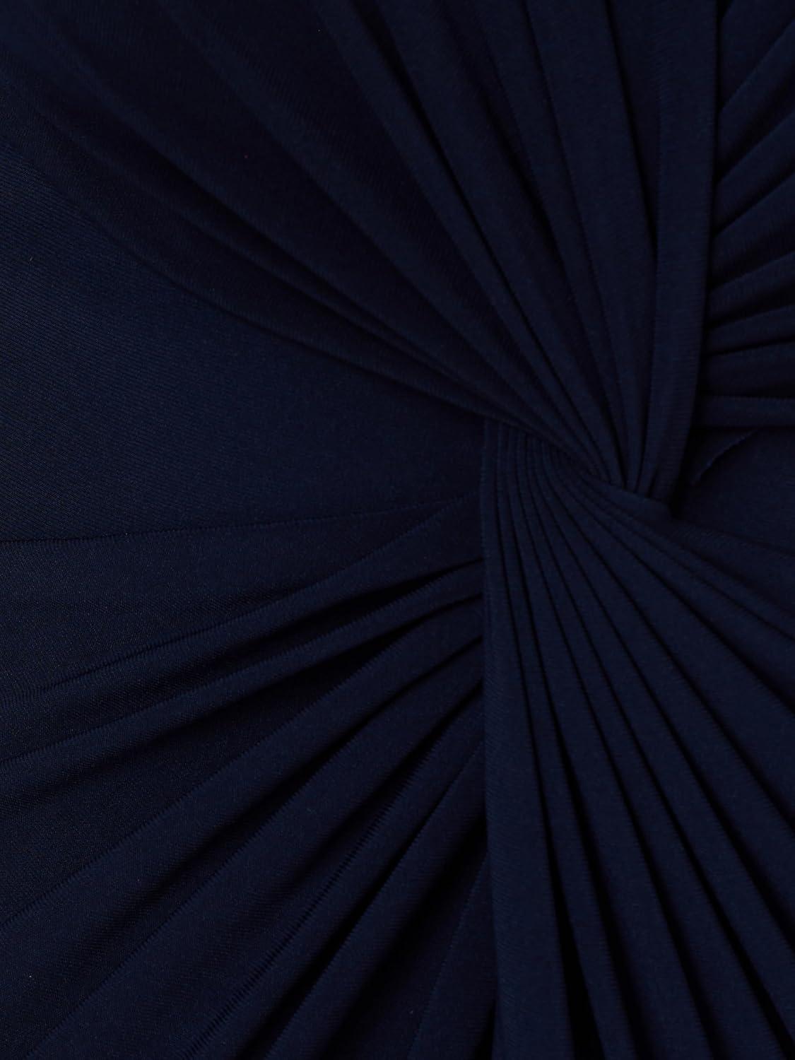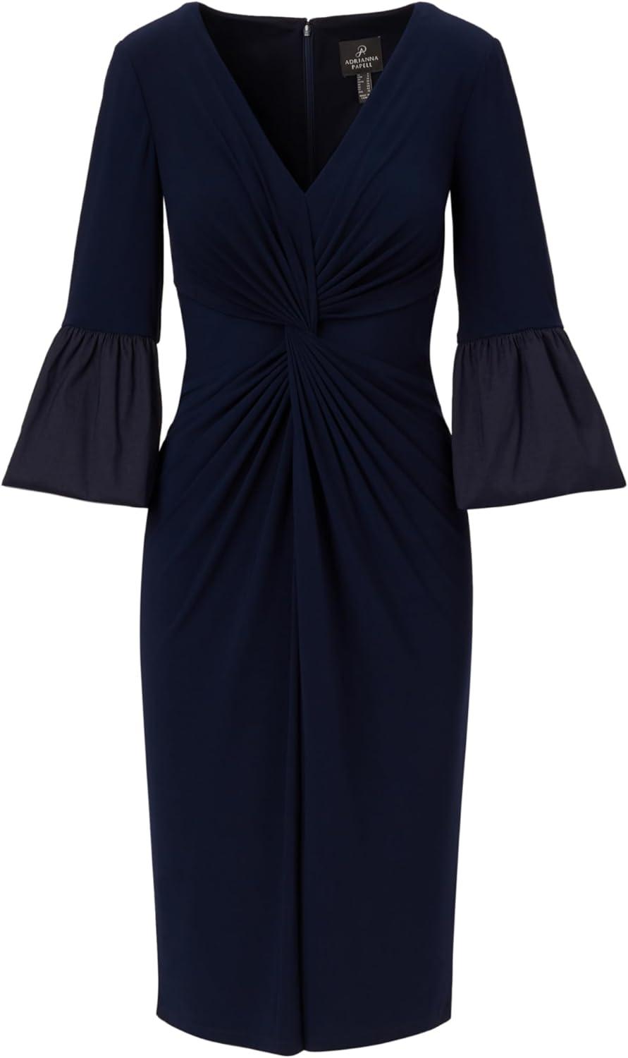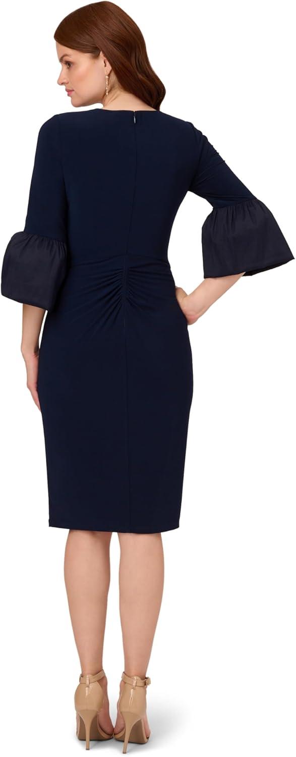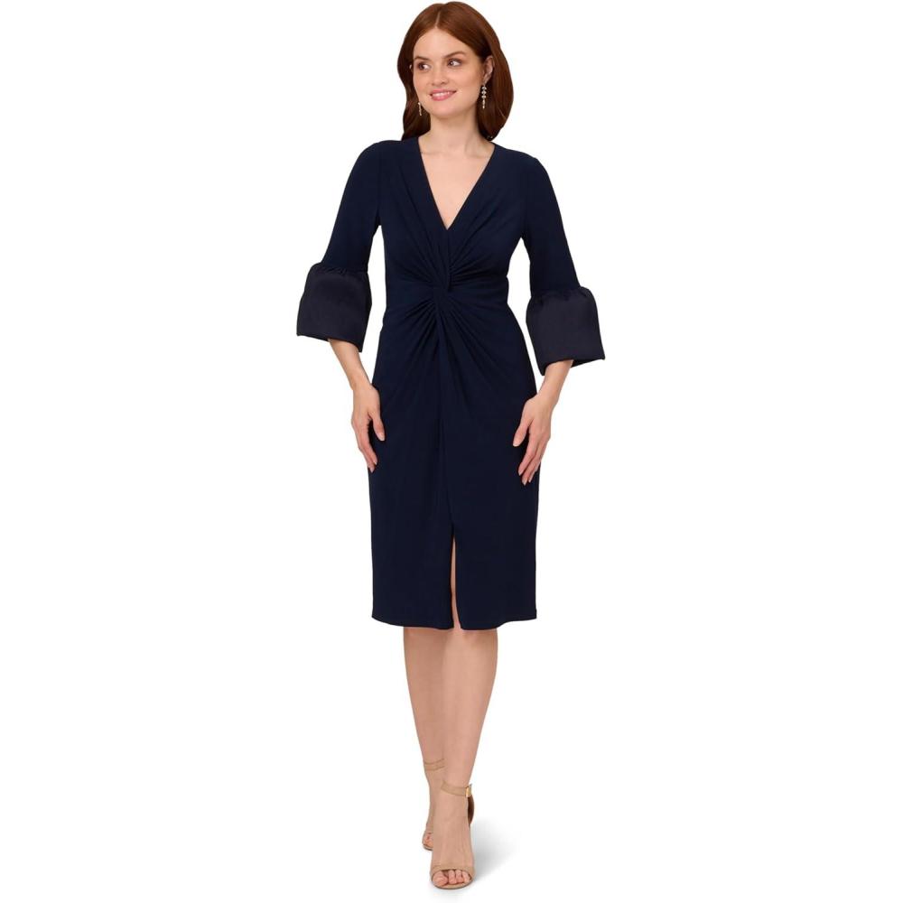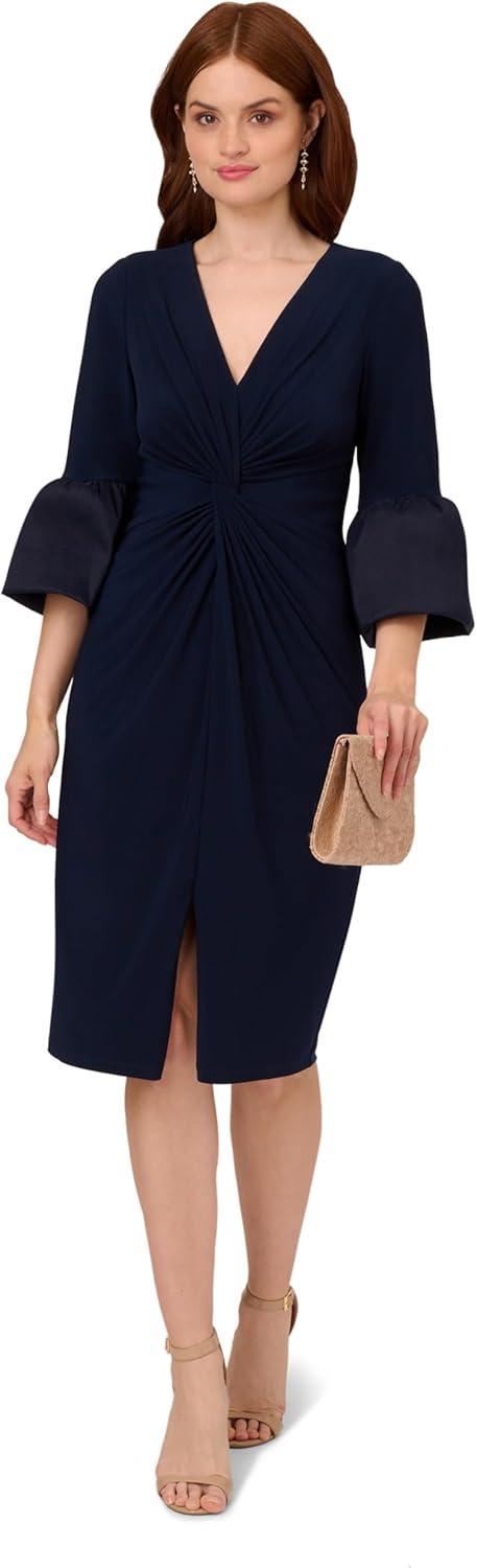 Step out of the house and into your element when you rock this jersey dress. This mid-length dress features a v-neckline, sheath silhouette, and three-quarter bell sleeves with luxe taffeta cuffs. Crafted from comfortable jersey fabric, this day dress has generous stretch and a figureflattering twist front that drapes the figure. Paired with metallic accessories for an evening out or neutral accessories for day, this three-quarter sleeve dress cant wait to get to wherever youre going.
