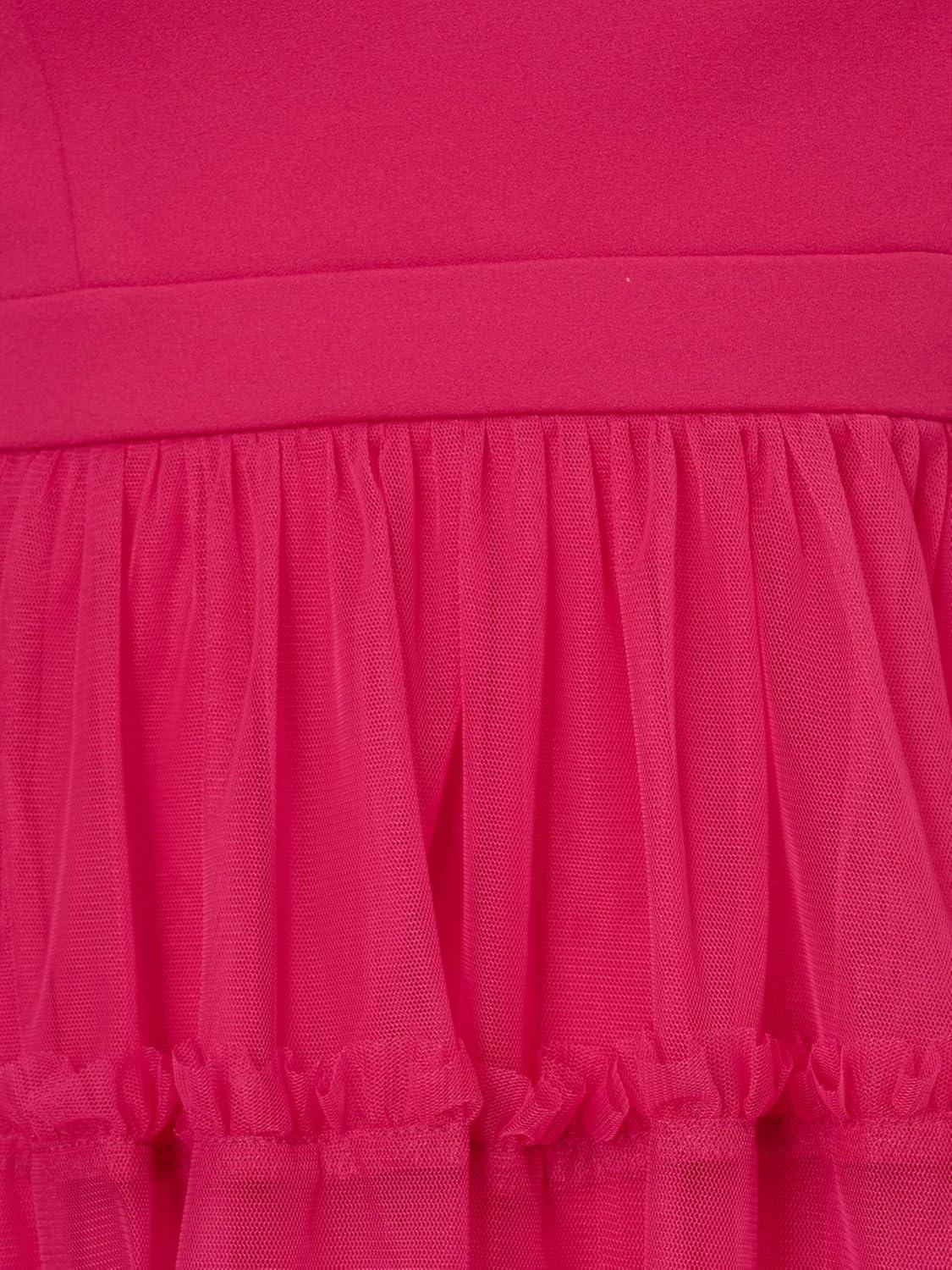 Modern fabric mixes make this classic fit and flare dress a sweet look. This midi dress features a fitted bodice with tank straps, a square neckline, and a tiered skirt. Fully lined, the bodice is crafted from a knit fabrication while the skirt is overlaid in mesh for added sweep. Pockets and a square back with center zip closure complete this delightful party dress. Styled with nude heels and sparkling accessories, this midi dress is a timeless look from wedding guest duty to cocktail parties