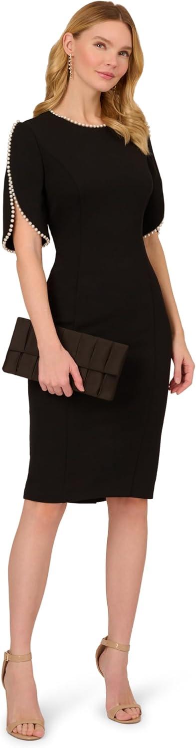An elevated take on the little black dress, this cocktail style will shine at your next party. This dress features a boat neckline, fitted silhouette, and slit elbow-length sleeves trimmed in pearl beading. Crafted from knit crepe fabric with some stretch, this midi dress is as comfortable as itis versatile. A zipper center back closure and a slit at the back of the skirt completes this little black dress. From cocktail hour to semi formal attire events, this short sleeve dress is a iconic choice.