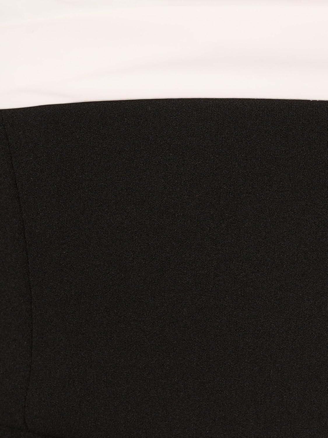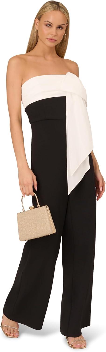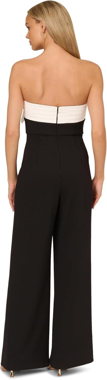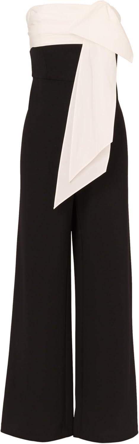 Slip into something a little more chic when you take this strapless jumpsuit out for the night. This jumpsuit features a strapless bodice and wide legs. Crafted from colorblocked crepe fabric and taffeta, this jumpsuit has some stretch and a waist seam at the natural waist. The taffeta bust has lightly pleated details with a self-tie bow with dramatic tails. A subtle zipper closure at the center back completes this jumpsuit which is appropriate from dressy daytime events to black-tie affairs. Accessorized with nude heels and a faux leather clutch, this jumpsuit will steal the show.