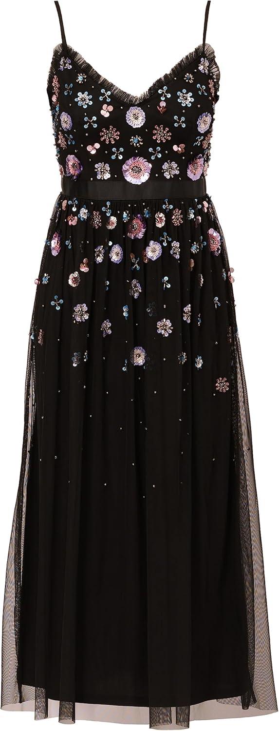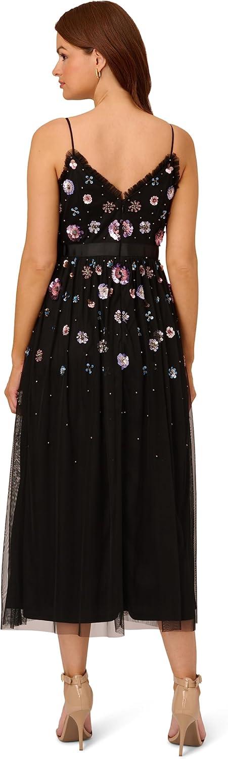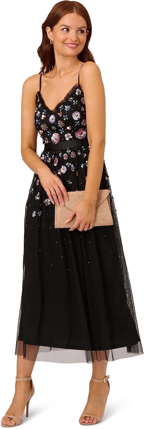 When it comes to sweet details, this beaded gown is dripping in them. This formal dress features a fitted bodice with spaghetti straps, a v-neckline and v-back, and an ankle-length soft skirt. Fully-lined, this ankle-length dress has a mesh overlay adorned with 3D beaded florals and a mix of metallic sequin and beaded details from the bodice just past the waist seam. A zipper closure completes this sleeveless gown. Styled with metallic heels and a beaded clutch, this dress is oh-so romantic.