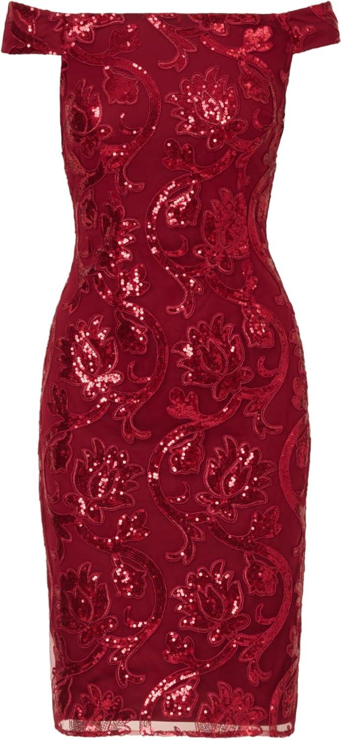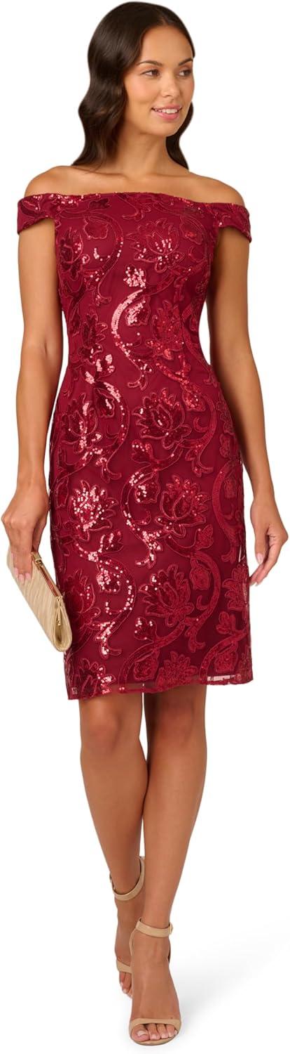 This beautiful but very wearable design contrasts a sleek sheath dress silhouette with textured and sparkling embellishments. Allover botanical embroidery set with shimmering sequins catches the light with every movement of the dress. The off-the-shoulder sleeves add amoment of romance with a back zipper securing the fitted design.
