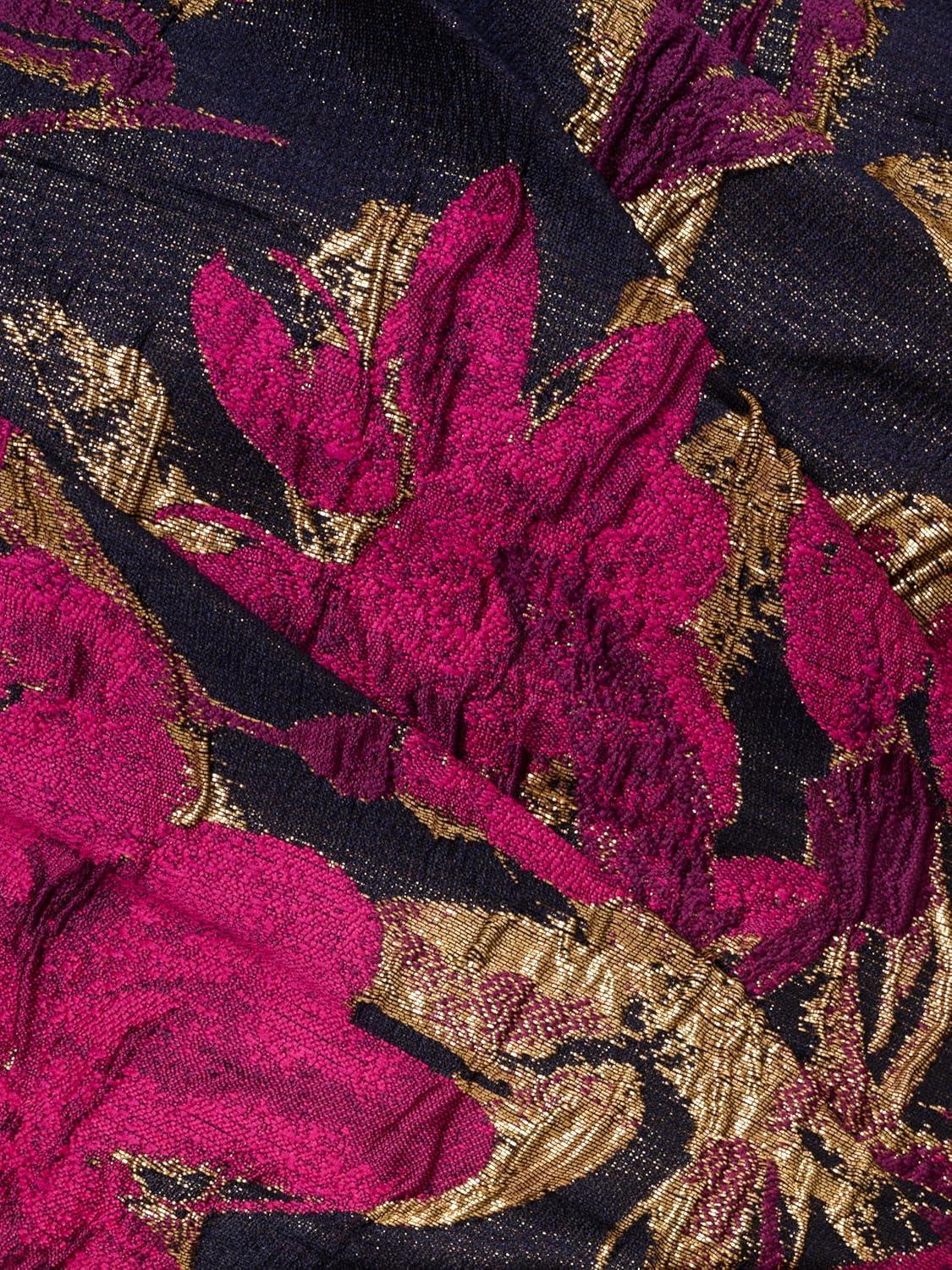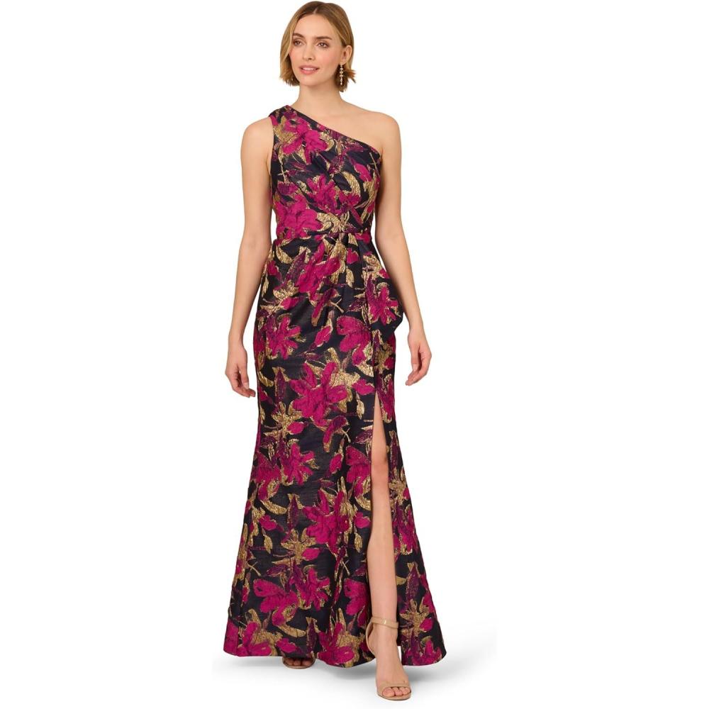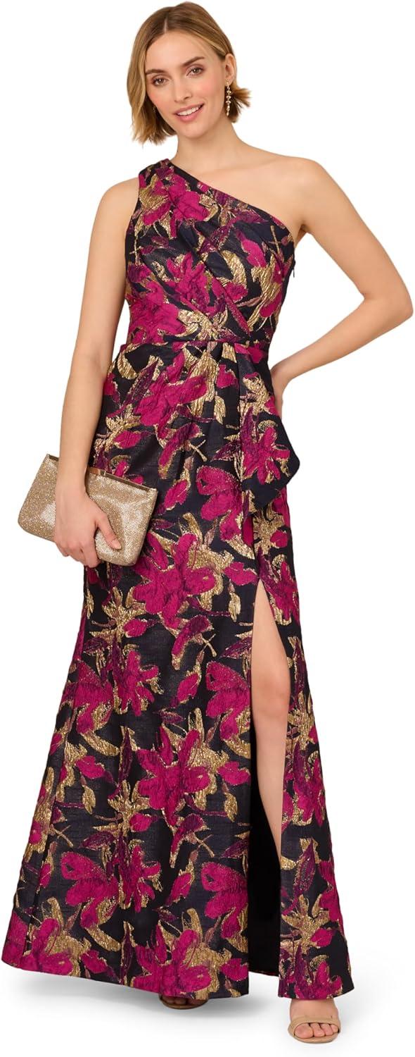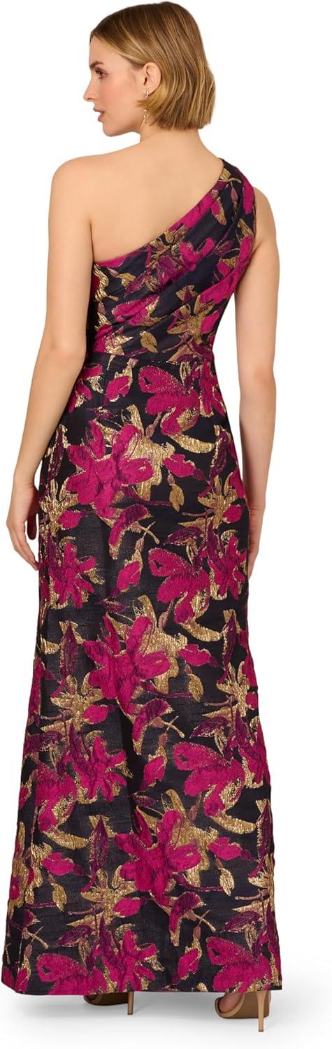 This is a mermaid gown made out of a jacquard fabric with one shoulder neckline, drape detail at skirt, side slit, and zipper at the side seam.