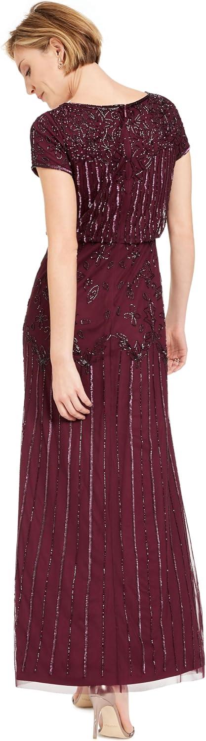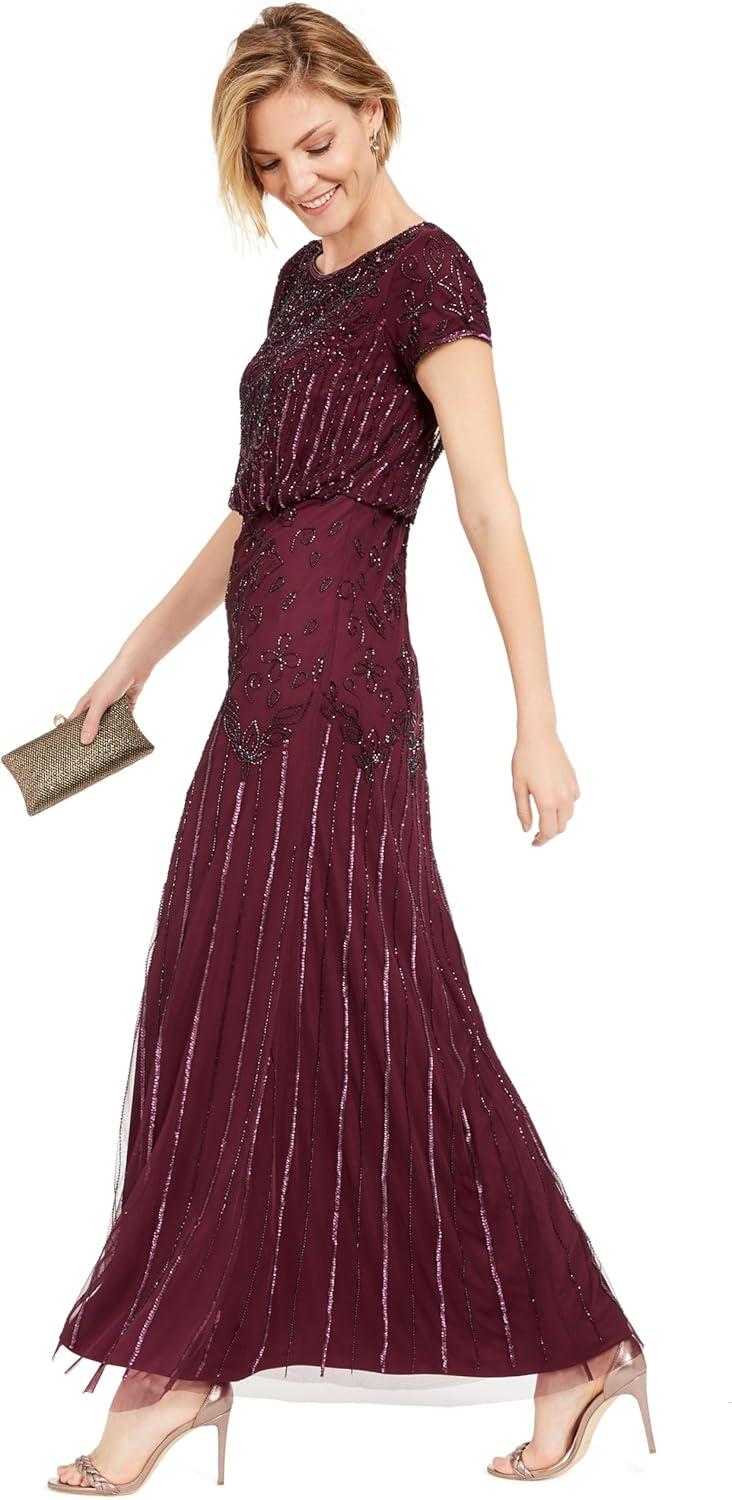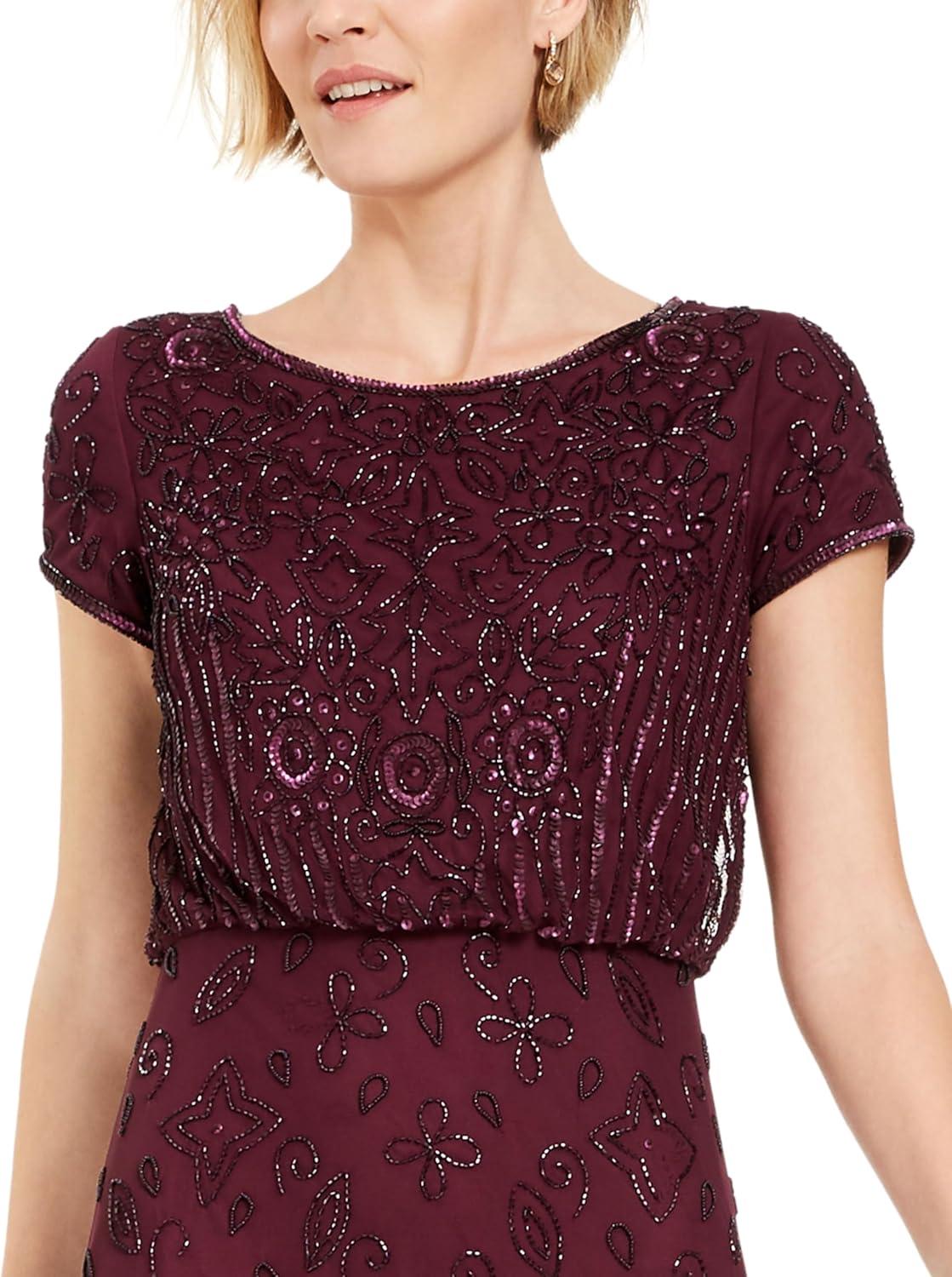 Fully beaded and embellished long gown with short sleeves, boat neck, and a blouson body