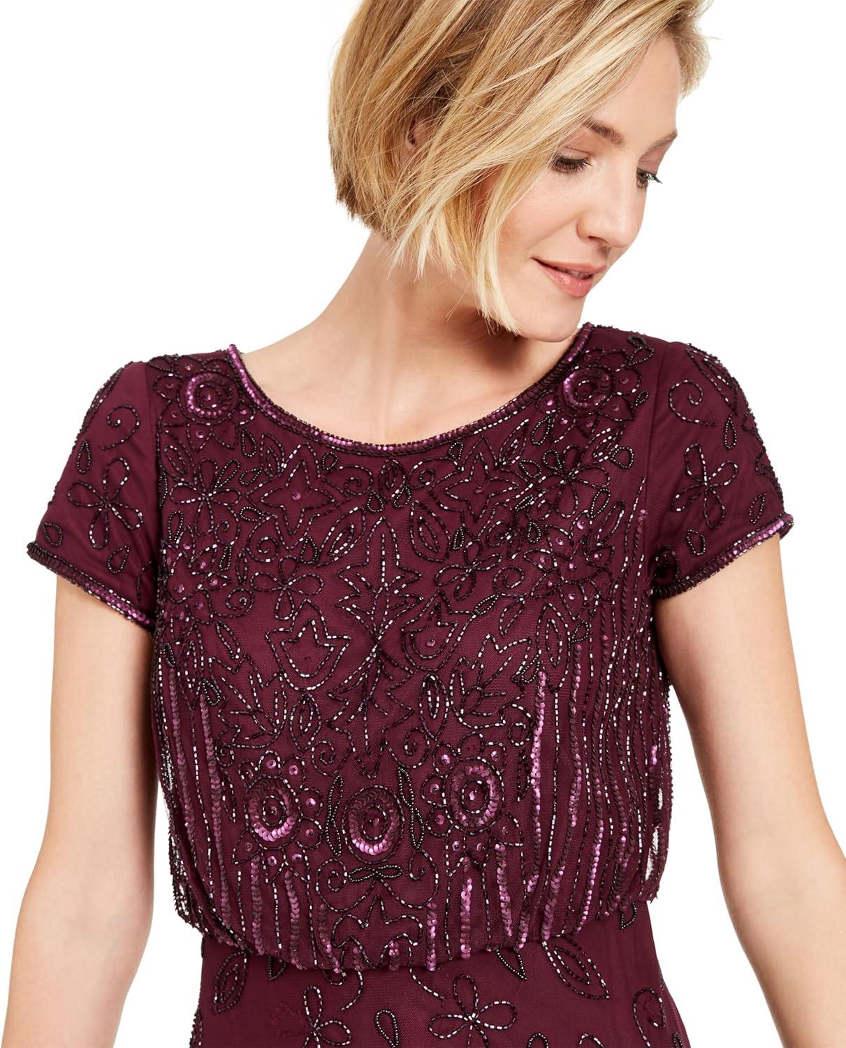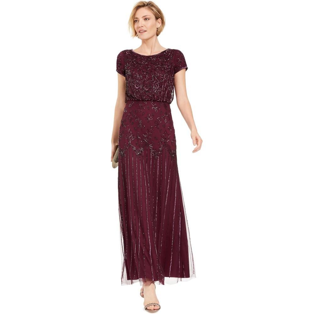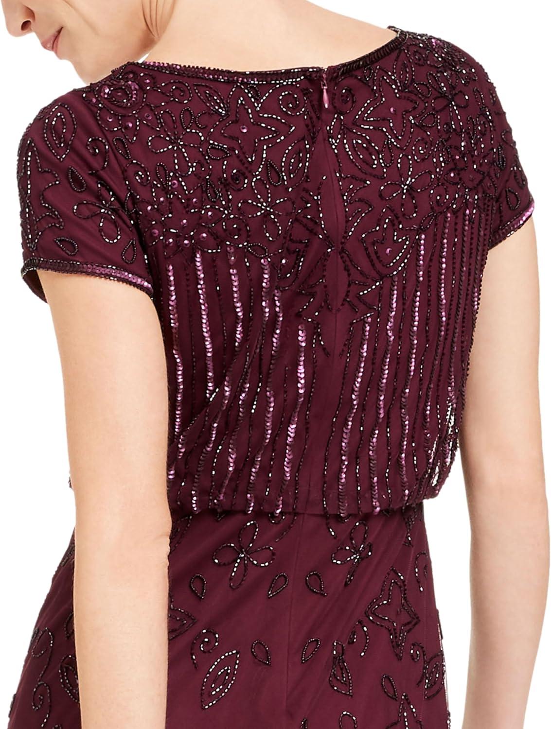 Fully beaded and embellished long gown with short sleeves, boat neck, and a blouson body