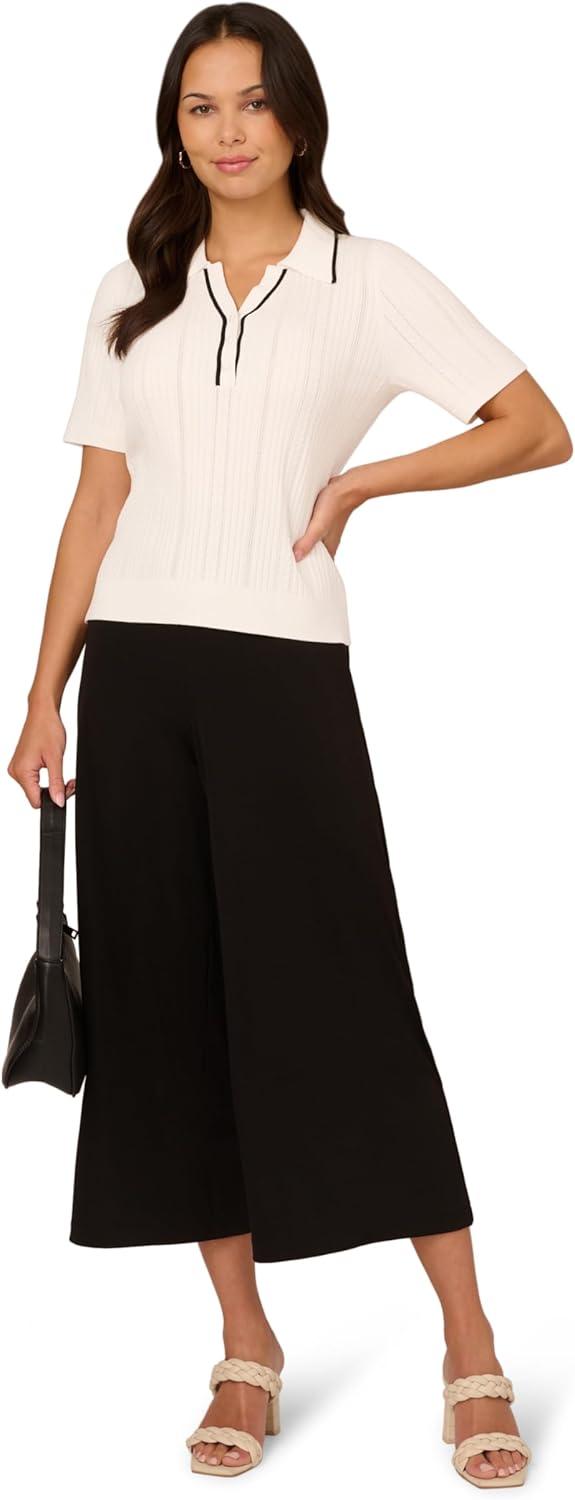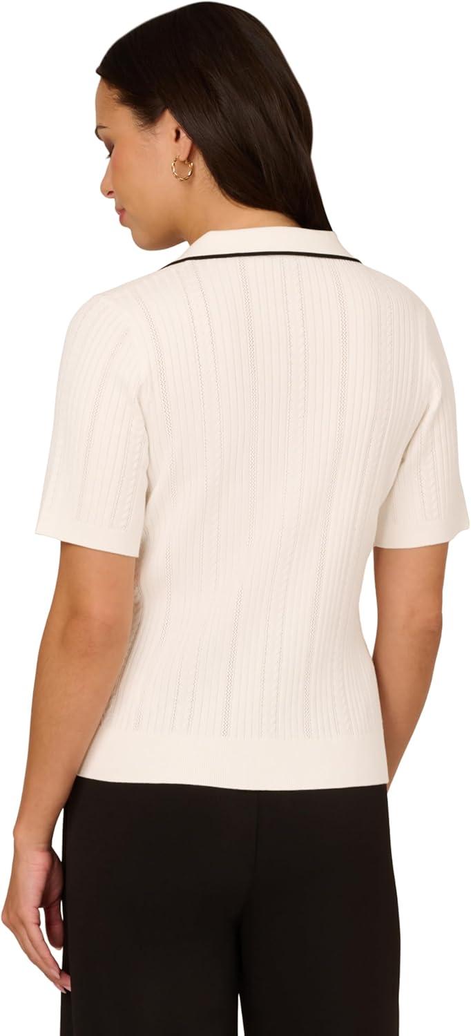 Adrianna Papell Women’s Open V-Neck Polo Mix Rib Cable Sweater with Short Sleeves(Ivory/Black)