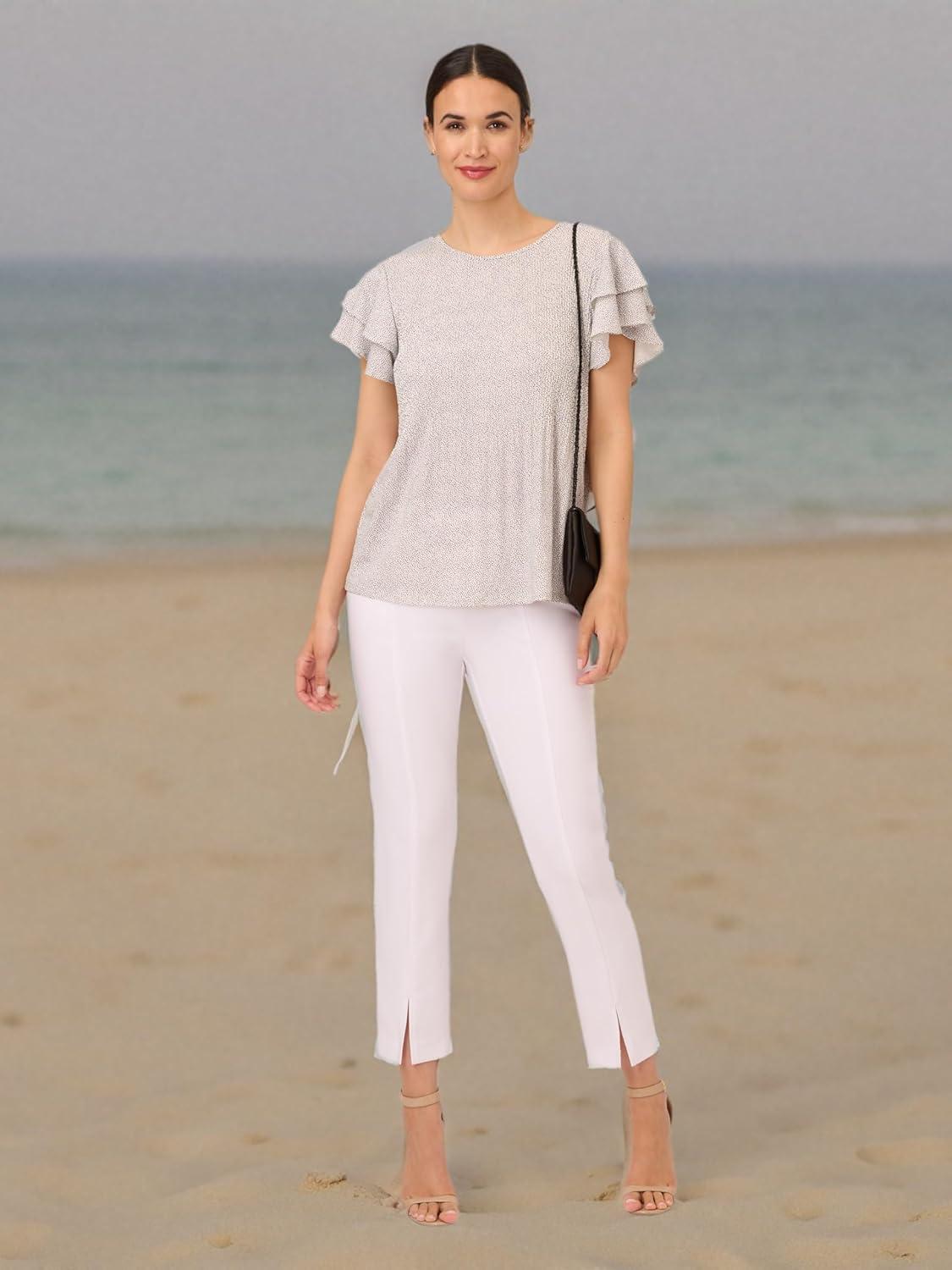 Ruffled details elevate this short sleeve top. This printed top features a circle neckline, loose fit, and double layer flutter sleeves. Crafted from a crinkle knit fabric, this printed top is a beautiful look. Paired with your favorite denim for a day out with family, or styled for a business meeting with flats and a tailored pant, this short sleeve top is incredibly versatile.