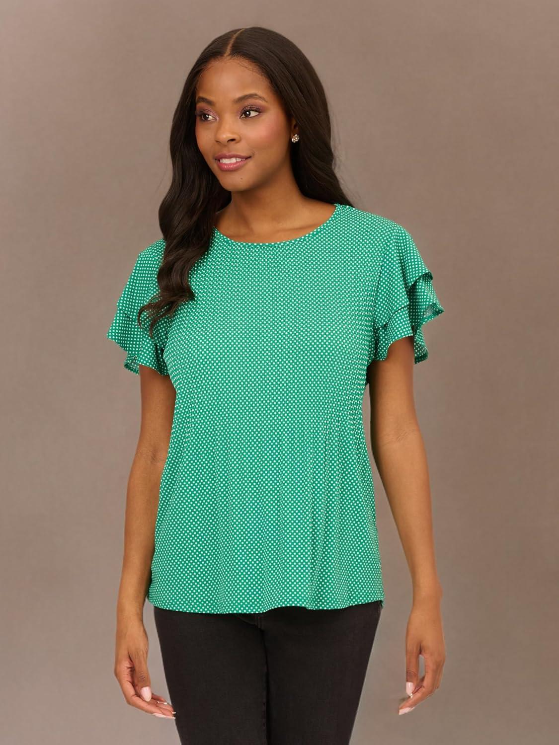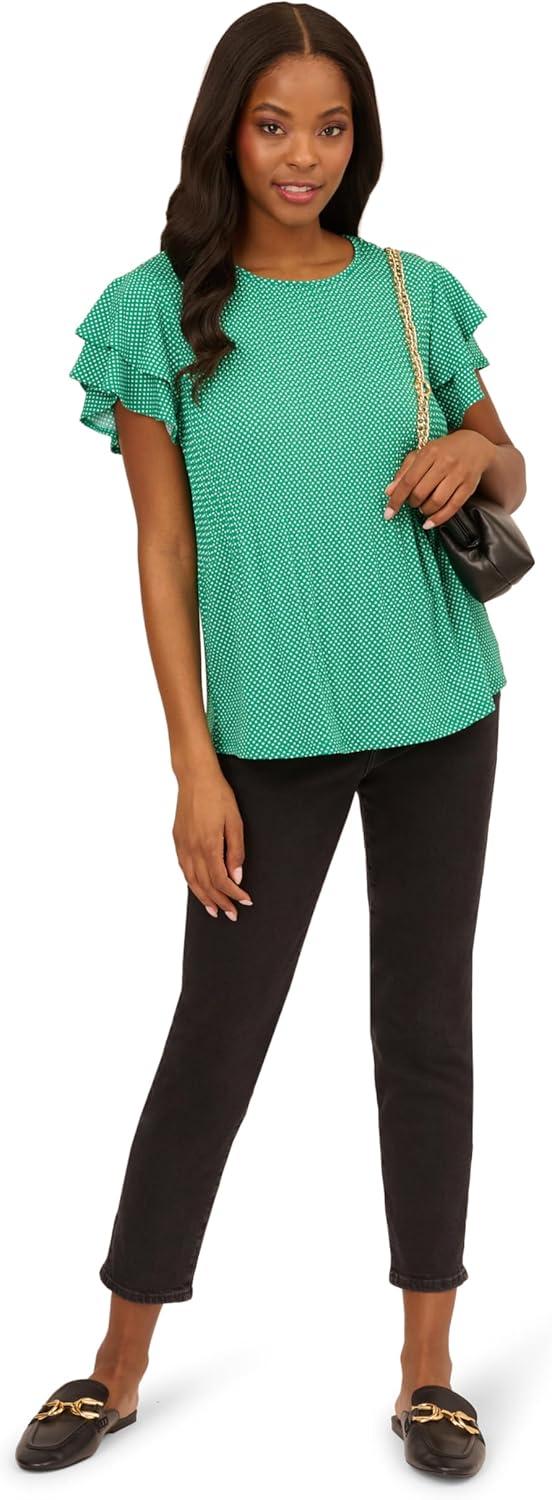 Adrianna Papell Womens Pleated Knit Double Sleeve Top(Vivid Green/ Ivory Small Dot)