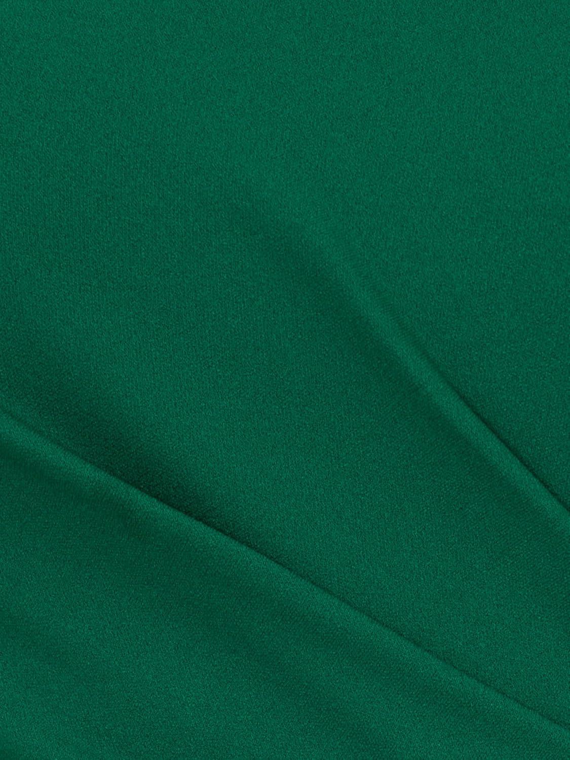 Subtle elements make this dress a show-stopping look. This formal dress features a crew neckline, halter bodice, and high-low skirt. Crafted from elegant crepe fabric, this evening gown has chic organza draping at the skirt and a comfortable level of stretch. A keyhole with a covered button closure and zipper back completes this crepe gown. Paired with metallic heels and a beaded clutch, this high-low gown is a sophisticated styling.