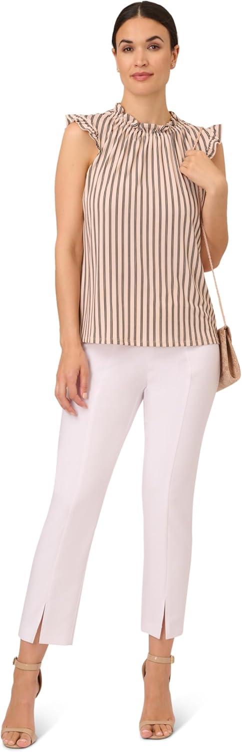 The perfect day to dinner top has arrived. This sleeveless blouse features a trapeze silhouette, ruffled mock neckline, and ruffle details at the arm holes. A keyhole with button closure adds a unique touch to the back of this work top. Soft and lightweight, this top is crafted from a stretch fabric youll be comfortable in all day. Paired with jeans for the weekend or a night out or a skirt or slacks for a day in the office, this cute top will look in place.