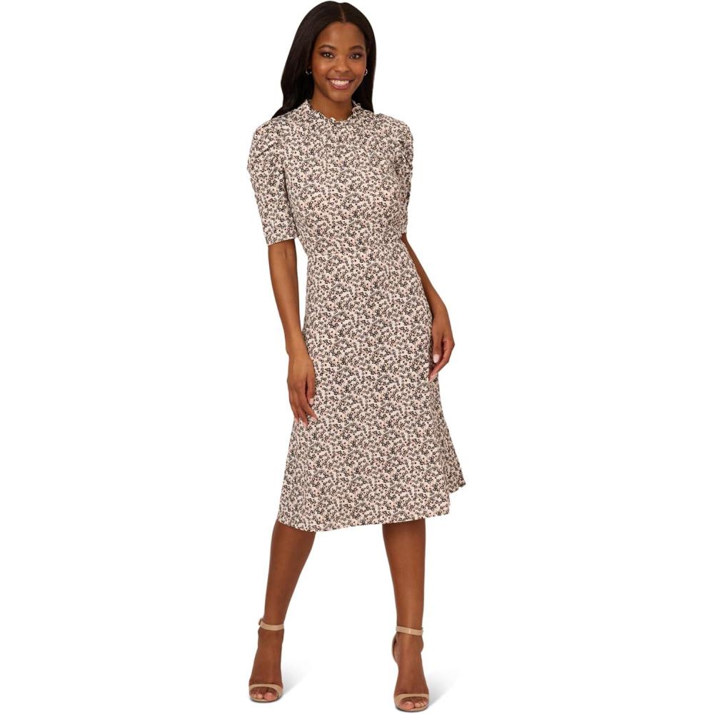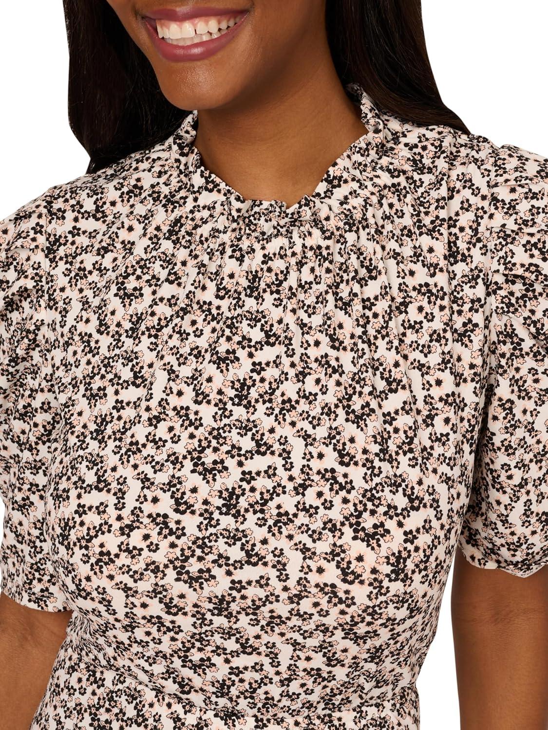 Adrianna Papell Womens Ruffle Neck Short Sleeve Dress(Black/Ivory Outline Dot)