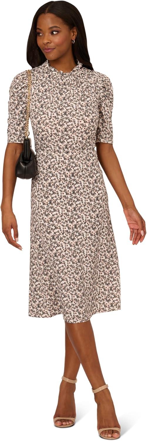 Feminine details bring this timeless midi dress to life. This desk to dinner dress features elbow length short sleeves, a fitted bodice with shirred details, and a ruffled mock neck line. The sleeves are slightly puffed for a pretty twist. A midi-length skirt completes this printed dress. Crafted from lightweight, allover printed fabric, this pull on dress has stretch and an elastic waist.