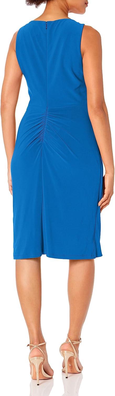 Start your day on an effortless note when you have this sheath dress in your closet. This short dress features a sleeveless bodice with v-neckline and figure-flattering draped details throughout. A surplice styling gives this sleeveless dress a faux-wrap look. Crafted from stretch-knit jersey fabric, this sleeveless dress is a comfortable style. A zipper closure and shirred details at the back complete this dress.