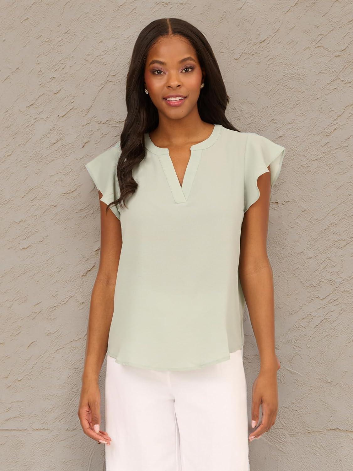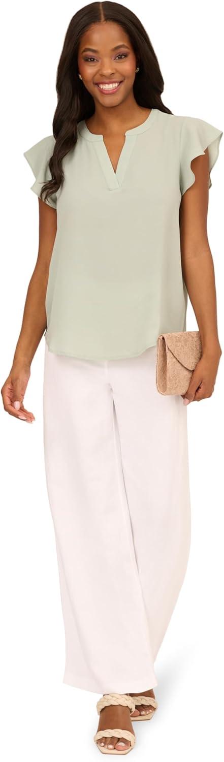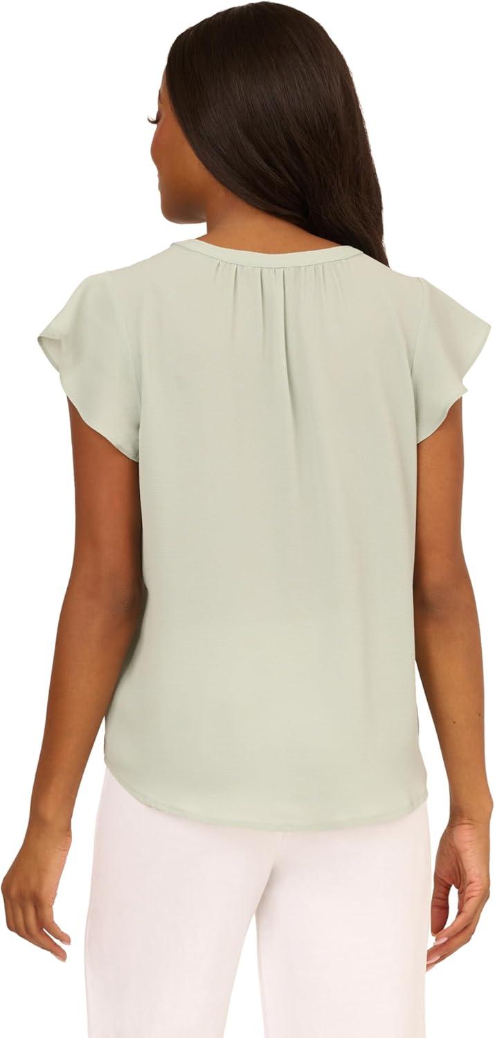 Adrianna Papell womens Solid Short Ruffle Sleeve Popover Blouse(Icy Sage)