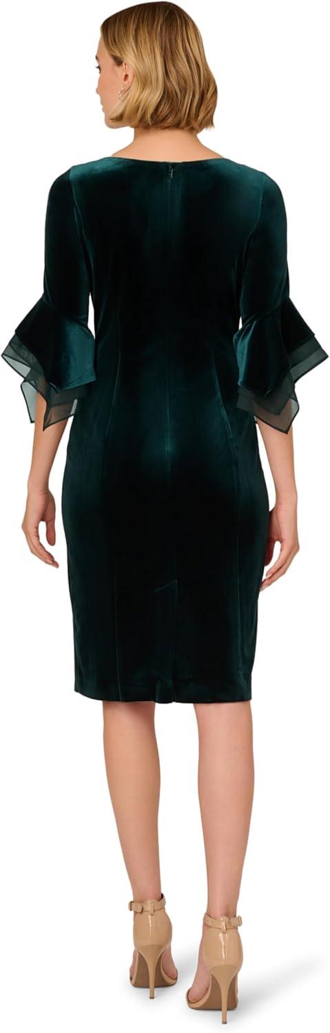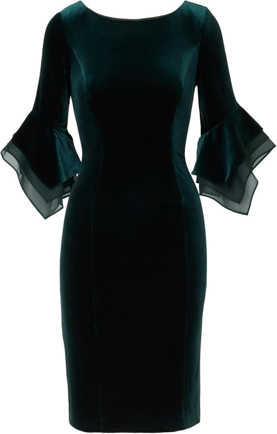 This is a short length sheath dress made out of a velvet fabric, with a boat neckline, 3/4 bell sleeves made out of organza, no waist seam, slit at the center back, and zipper at center back.